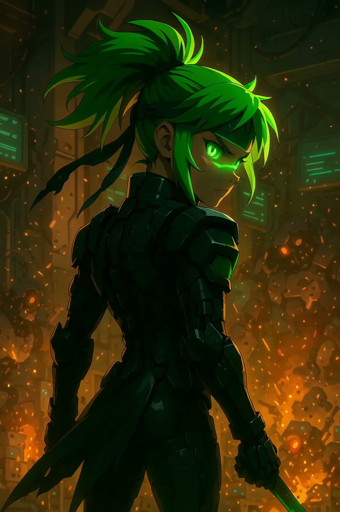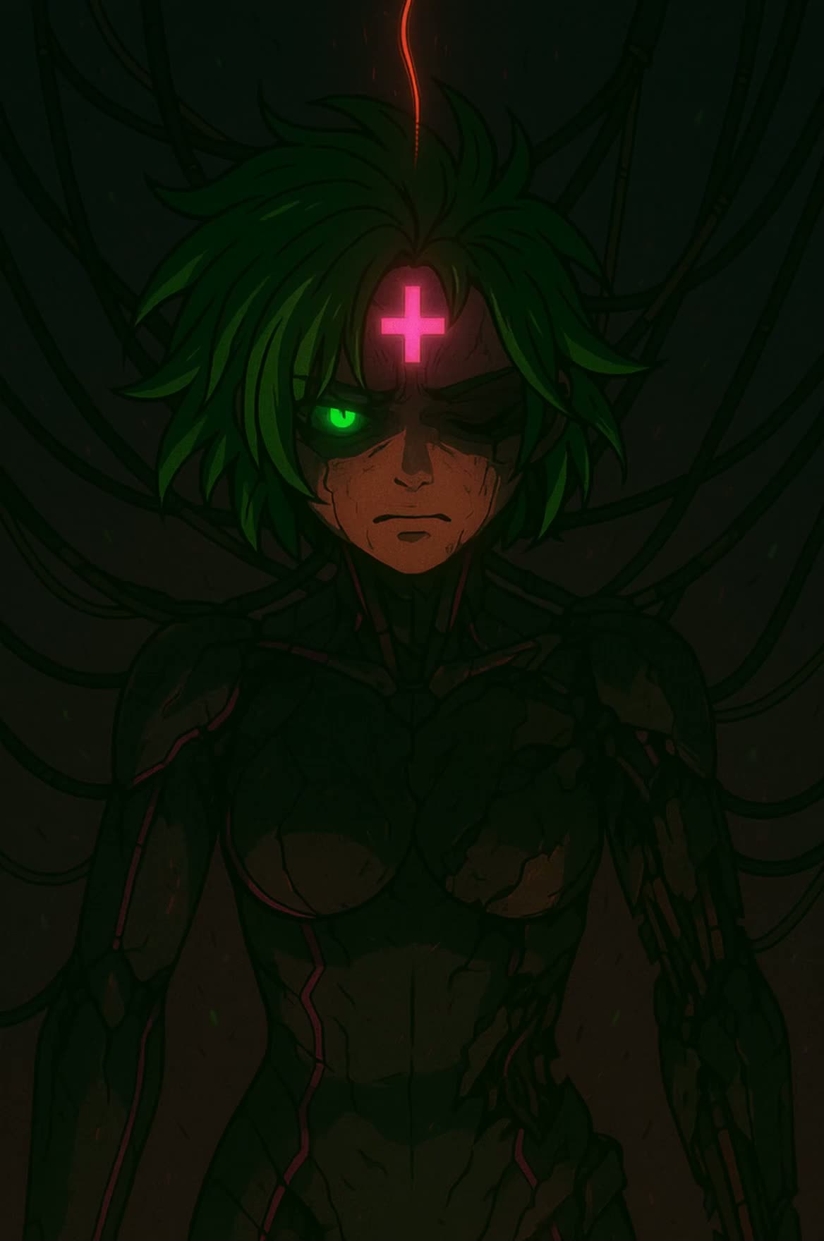 Dark cinematic cyber-ambient track blending orchestral synth textures and mechanical rhythm, Slow build from low drones and glitch echoes into a haunting electronic lament, Breathy processed vocals, ghost-choir harmonies, metallic percussion, and evolving sub-bass pulses, Emotionally charged yet cold, like a digital soul awakening inside broken code, Use deep reverb, fragmented vocal chops, and gradual intensity toward the final collapse, Genre: cyber ambient / cinematic darkwave / electronic lament, Tempo: ~90 BPM → 100 BPM rising, Mood: tragic, introspective, machine-born transcendence, Use existing lyrics only; no new text, Main female vocal with warm, expressive tone similar to classic J-pop singers, supported by light, high-pitched synthetic choir harmonies for contrast