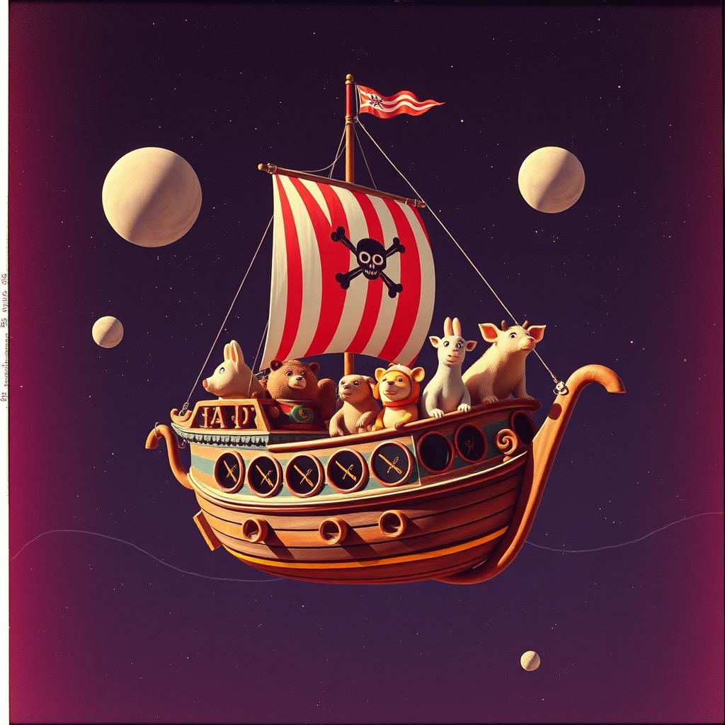 Dark pirate folk, male pirate vocals, cpace Cabaret-Cabaret with humorous elements - bright, energetic, with hints of retro funk and jazz swing, adding a cheerful mood and a bit of a carnival atmosphere, Rhythm Section: Bass guitar - live, with light "jumps", creating a rocking rhythm in the style of jazz funk, Drums (bass drum, snare drum, percussion): The barrel is clear, with accents on the "strong" beats, the snare drum is fast, with "funny" rhythmic inserts, and the percussion (congas, bongos) adds an exotic and cheerful touch, Bright, with short "ringing" inserts and solos in the style of swing or funk, Clarinet or oboe add a comedic touch, The main melody is in the style of retro cabaret or jazz swing with a fast tempo (about 120-140 bpm), The harmony is bright, with the use of major chords and light dissonances for a comedic effect, Additional effects: Inserts with "talking" animal sounds (such as funny growls or meows)