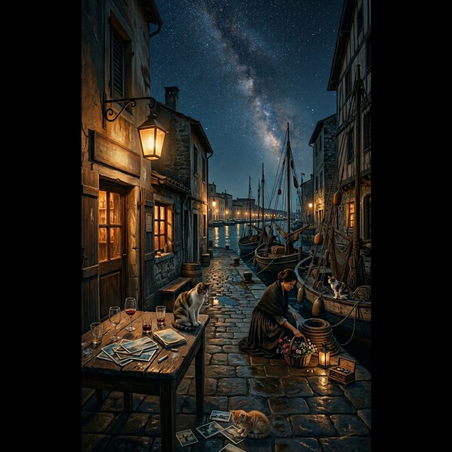 Male lead vocals in warm, intimate folk style, accompanied by traditional acoustic instruments like guitar, accordion, and soft hand percussion, Male choir harmonizing strongly in the choruses, rustic, raw, full-bodied, like fishermen singing together on a dock at sea, slightly imperfect, emotional, and soulful, Slow to moderate tempo, simple natural rhythms, creating a timeless folk-maritime atmosphere, Gentle cinematic strings and soft ambient pads underlay for warmth and space, Light open-air reverb to evoke wind and sea, giving spaciousness and natural outdoor feel, Emphasize unity, community, and authentic folk feel, highlighting communal, rustic, and nautical chorus moments, Perfect for poetic and dramatic lyrics with maritime, folkloric, and soulful chorus presence