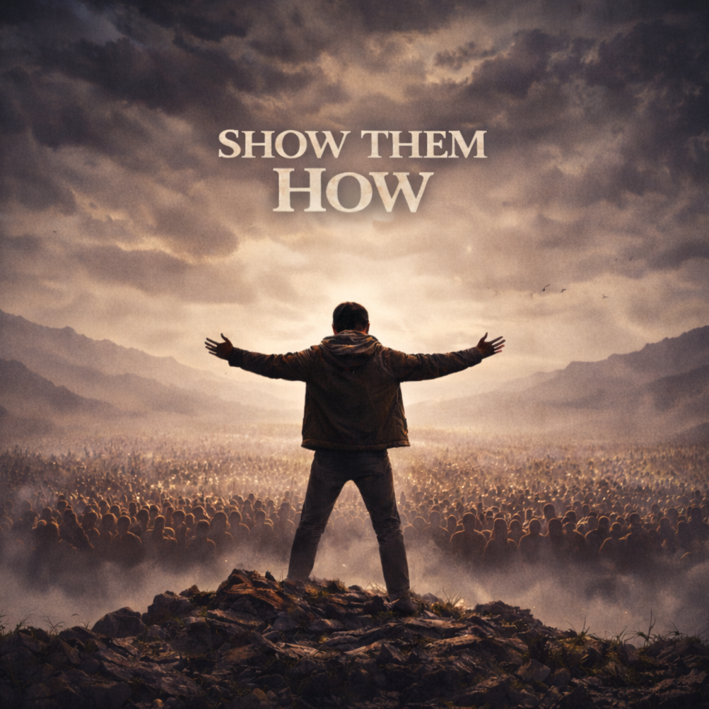 Tempo 78 BPM (half-time feel), key D minor, Dark melodic rock/metal arrangement: dual overdriven electric guitars (drop D) with palm-muted chugs, sustained lead lines with delay, occasional harmonized octaves, Bass guitar tightly locked to kick, slight grit/saturation, Drums: heavy kick, tight snare with gated room, sparse tom fills, controlled cymbals; occasional double-kick bursts in pre-chorus, Vocals: emotive male baritone, close-mic, breathy-to-gritty belts in choruses, subtle doubles and low harmonies; light slapback + plate reverb, Production: dense but clear low-mids, wide guitars, mono kick/bass, sidechain guitars slightly to kick, parallel drum compression, tape saturation on mix bus, moody atmosphere with low synth pad/ambient noise bed, minor-key guitar intro and breakdown with reverb tail, ‑happy pop, ‑EDM festival house, ‑reggae, ‑funk, ‑upbeat ska