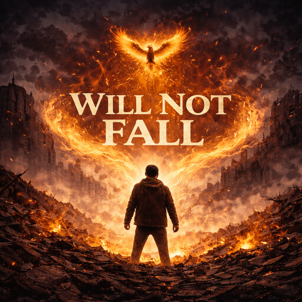 An intense, cinematic epic nu metal track at 112 BPM, featuring powerful distorted 7-string guitars with heavy chugging riffs and intricate djent-like syncopation, driving syncopated bass lines, and dynamic, precise double-kick drumming, Incorporate soaring orchestral strings, powerful brass sections, and a massive choir to enhance the epic, cinematic atmosphere, Vocals should range from aggressive, rhythmic rap-rock delivery to clean, soaring melodic singing, transitioning into raw, impassioned screams and guttural growls during climactic moments, The song builds from a brooding intensity to an explosive, triumphant anthem, embodying themes of resilience and overcoming adversity, ‑bubblegum pop, ‑smooth jazz, ‑traditional folk, ‑lullaby, ‑pure classical, ‑disco, ‑techno