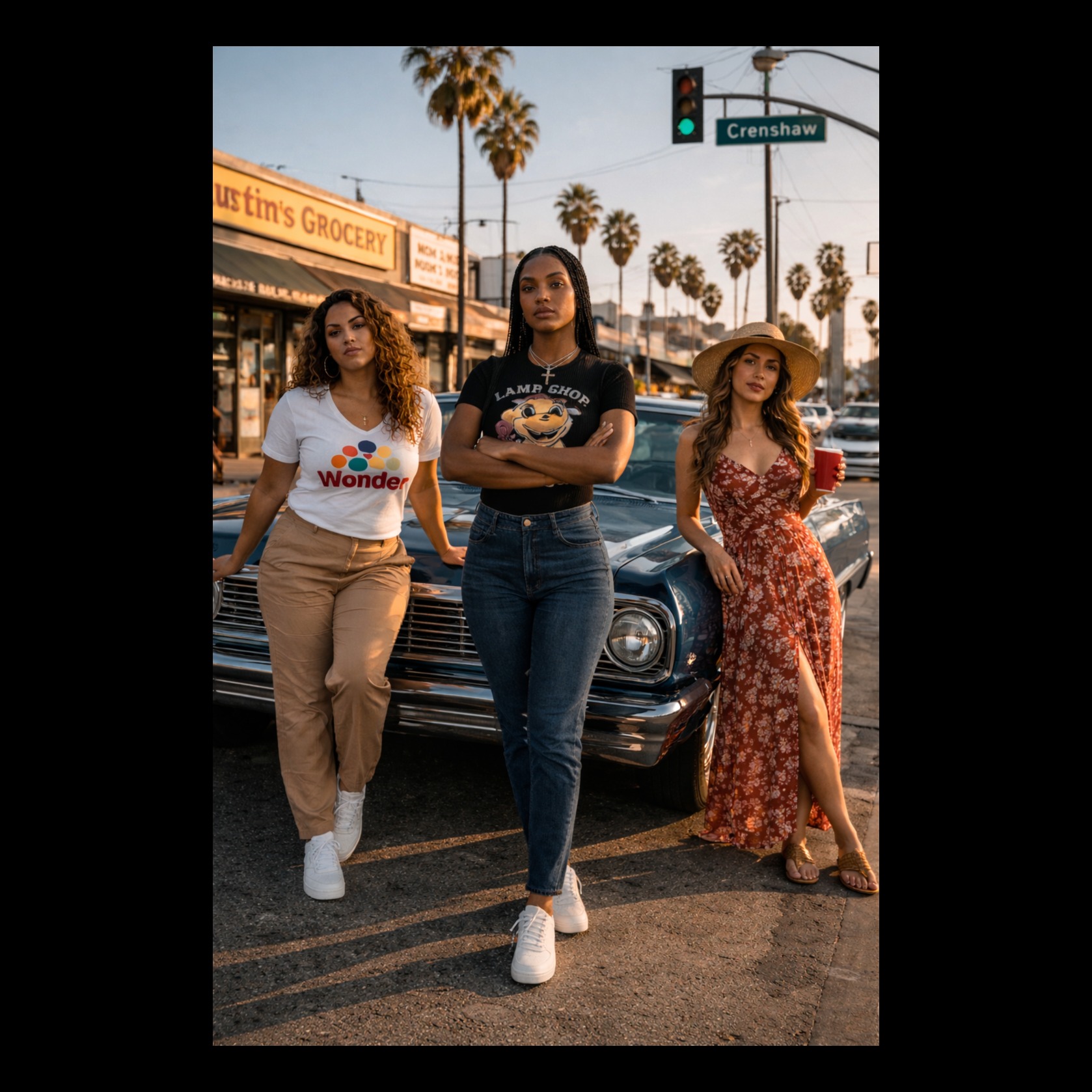 Style: Cinematic West Coast Hip Hop, 95 BPM, G-Funk, Gangsta Rap, Snoop-style piano-driven lowrider vibe, Sun-soaked, palm trees, urban murals, ocean breeze, Instrumentation: Punchy kick, snappy snare, ghost hi-hats, sliding G-funk synth bass, minimal melodic piano chords, light atmospheric pads, muted clean funk guitar licks, smooth lowrider groove, Vocal Production: Layered cinematic hooks, whispered intimate intro, epic orchestral textures, Female1 (Cali Red): Bubbly, playful, airy EQ, melodic rap, shimmering reverb, Female2 (Wonder Bread): Smooth, grounded, warm, centered, soulful delivery, dry presence, Female3 (Baby Lamb): Staccato, aggressive, menacing, hard-hitting, heavily compressed, dark resonance, rhythmic precision, sharp consonant emphasis, whispered grit, high-pressure delivery, fast-paced cadence, Dynamics: Cinematic transitions, orchestral swells in Verse 2, beat drops for Verse 3 intensity