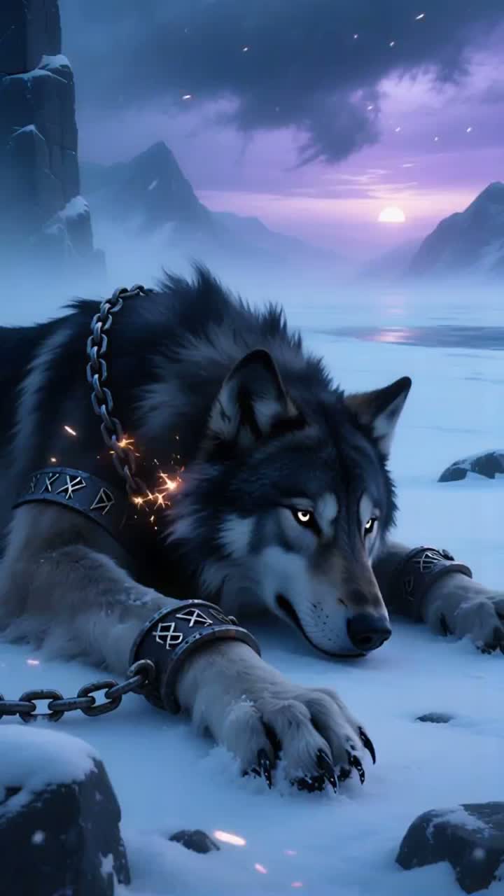 A chained wolf beneath a dying sun, blood on snow, gods trembling, twilight skies, prophetic sorrow, the calm before RagnarĂśk