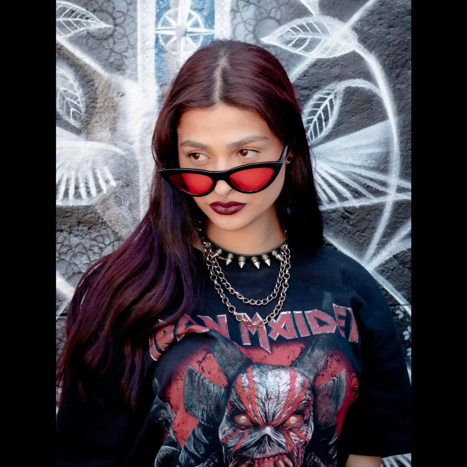 Genre: Hard rock / classic rock fusion, ~134 BPM, key of E minor, Style: Aggressive, punchy, riff-driven, Mood: Defiant, powerful, edgy, Verse: Tightly phrased vocals with bold, controlled vibrato and sharp enunciation, Use a mezzo-soprano belt with grit and subtle distortion—channel the raw rock energy of late-70s female-led rock, Electric guitar riffs dominate with a galloping rhythm and muted palm technique, Percussion is tight: hard-hitting snare, sharp tom fills, and locked-in bass guitar lines, Chorus: Full-on vocal power—belting into upper register, doubled and slightly panned, Crisp drum crashes and harmonized lead guitar licks mirror vocal intensity, Bridge: Instrumental shift—slower, heavier guitar chug with a blues-rock twist, vocals drop into a slightly sultry lower tone before bursting back into chorus, Instrumentation: Distorted twin electric guitars (Marshall stack tone), punchy bass, acoustic kit with reverb-heavy snare, tambourine accents, Production: Classic analog ro