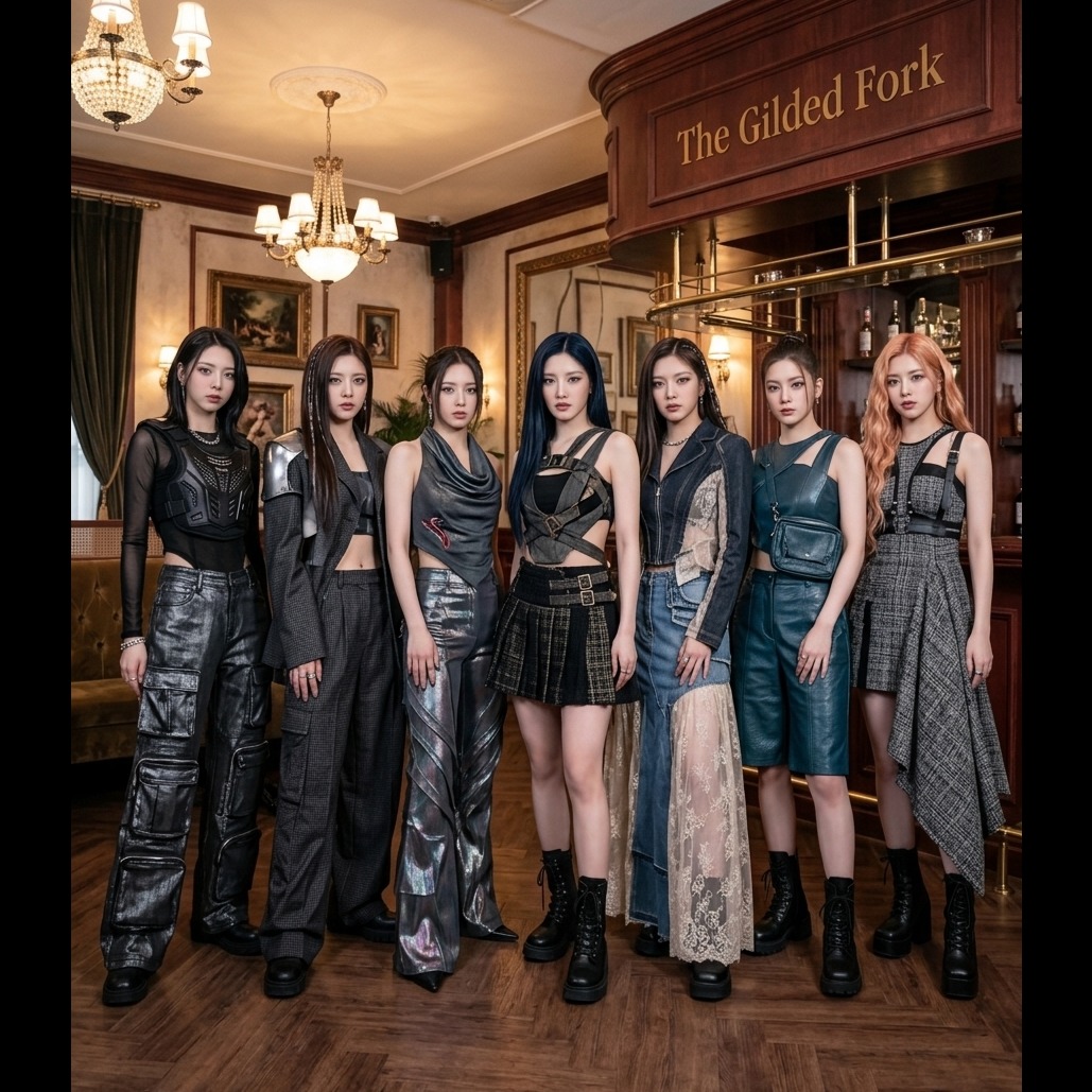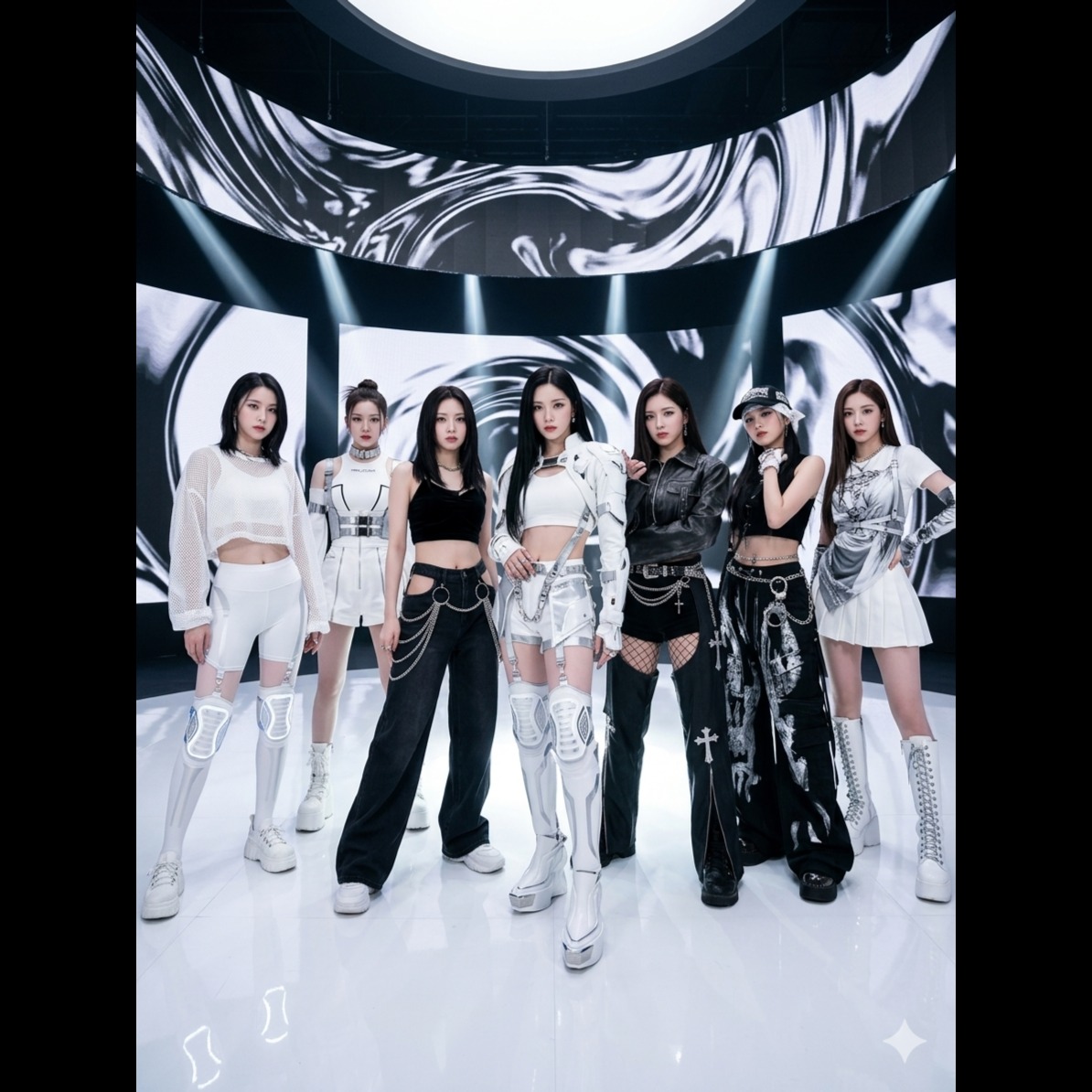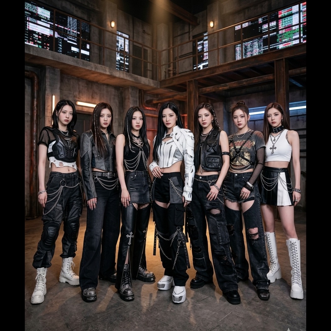 2-beat, fast rapping, nu disco, deep-bass, distorted guitar, inspiring atmosphere, brass accents, rap, vocal layering, synthcore, shuffle, shimmering pads, accordion, breakbeats, floating vocal textures, trap/rap, guitar bass, pop rock, 7-MEMBERED Kpop girl group, so 7 different voices, except for the rap part, the rap has only 1 member doing it