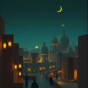 Create a mystical, exotic, oriental cityscape inspired by the fantasy-city of Fasar, The scene is set at night, with the streets illuminated by flickering golden lights, creating a magical, almost hypnotic and seductive atmosphere, Merchants call out their wares, while thieves move stealthily in the shadows, The architecture blends Arabian palaces, curved towers, and winding alleys, The moon shines brightly, casting long shadows over the vast desert beyond, Include sounds of soft, rhythmic Darbuka and Tabla percussion, and the haunting melody of an Oud and Ney flute, The city pulses with life, but there’s a sense of mystery and enchantment, like the air is filled with secrets, The tempo is moderate, with smooth, flowing rhythms and light synth pads that create an ethereal, magical vibe, The music should evoke the feeling of an Arabian Nights-style adventure, full of wonder, danger, and timeless beauty, Belly dancers, alladin