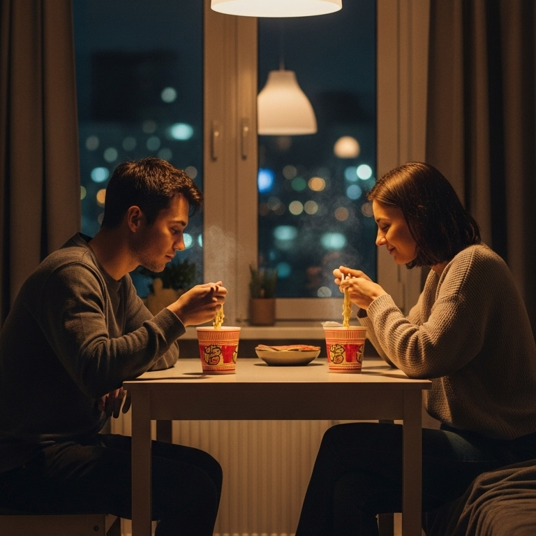 A Japanese rap song using ramen as a metaphor for love and dating, Theme: instant love from apps (fast, easy, like instant noodles) vs old-fashioned love (letters, slow cooking stew), Both ways have pros and cons: instant is quick but shallow, slow is deep but heavy, Lyrics should mix playful wordplay, rhyme, and social satire with emotion, Structure: Intro → Verse → Hook → Verse → Bridge → Hook → Outro, Verses compare past and present: letters vs DMs, street chance vs swipes, slow waiting vs instant matching, Hook repeats: “Instant or slow, both have flaws, but both are truth, ” Outro gives a humorous twist: after all the preaching, the rapper admits he fits neither instant nor slow, ending self-deprecating with “Oh my God! That’s my life, ” Style: Lo-fi × Hip-hop × Jazzy, BPM ~92, groovy bass, light snare, smooth relaxed beat, Vocal: natural Japanese rap tone, not husky, conversational and playful, with warmth and human vibe