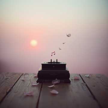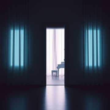 A slow, atmospheric post-rock and ambient electronic track opens with a minimal, repeating piano motif and soft analog synth pads, Distant clean guitar swells add depth, a subtle electronic pulse creates momentum, and airy female vocals float above layered harmonies within a spacious, cinematic mix