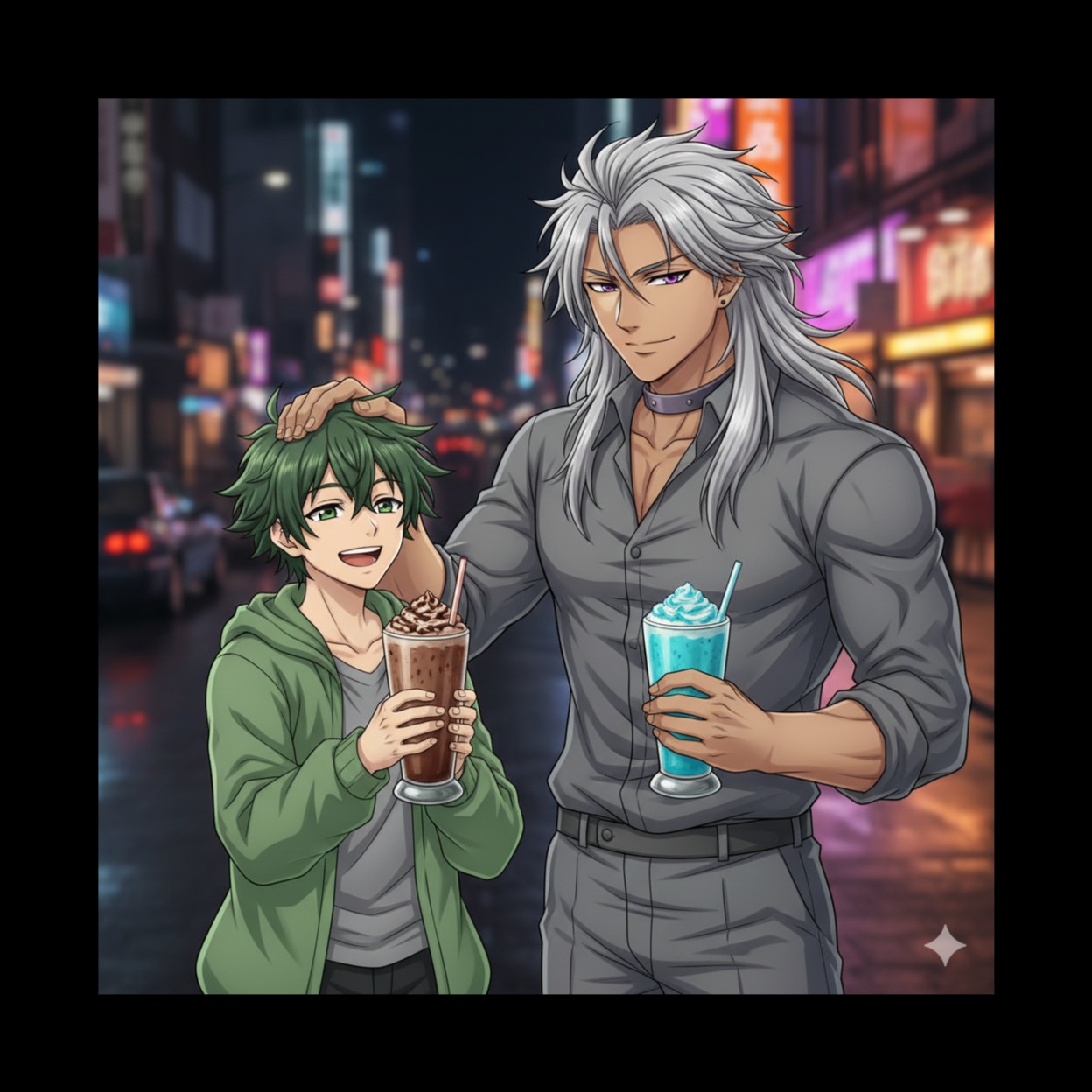 Sound Elements: soft electronic sounds, acoustic guitar riffs, light percussion (bongo/cowbell), synth for neon night city feel, sweet male vocal harmonies, BPM 171, very fast