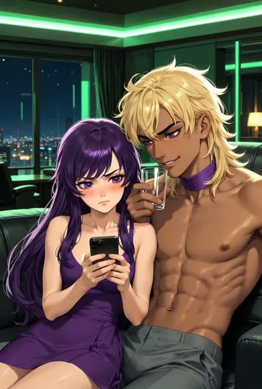 Visual Inspiration: neon-lit cityscape at night, chocolate pyramid centerpiece, sparkling chocolate reflections, hands and lips interacting playfully, strawberries, cocoa powder, candy, colorful but elegant tones