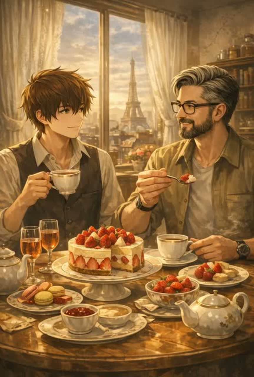 Vocal: warm gentle male vocal, soft storytelling tone, slightly airy texture, intimate and emotional delivery, Genre: French Cinematic Waltz Pop, Parisian Café Waltz, Chanson Film Soundtrack, Style: romantic French movie ending atmosphere, nostalgic yet hopeful, poetic dessert themed storytelling, Instrumentation: piano, accordion, upright bass, brushed jazz drums, glockenspiel, soft strings, light acoustic guitar, warm analog pads, Rhythm: gentle 3/4 waltz groove, Mood: fresh morning light, strawberry sweetness, fragile happiness after a long night, dreamy Paris café morning, Production: cinematic reverb, warm vintage tone, subtle vinyl texture, soft café ambience, Tempo: BPM 92