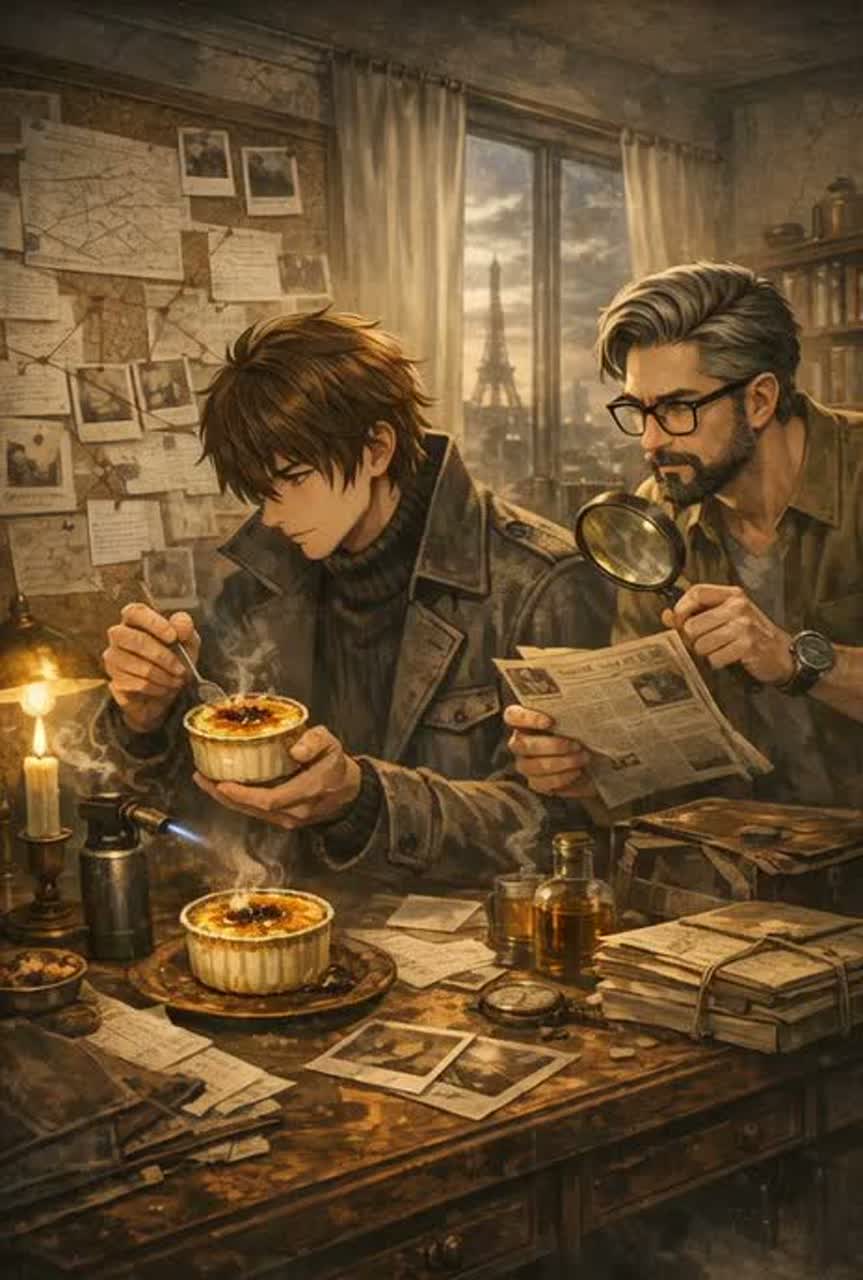 Vocal: warm intimate male vocal, slightly husky tone, emotional storytelling like a late night Paris café singer, Genre: French Cinematic Waltz Pop, Parisian Chanson Waltz, Café Film Soundtrack, Style: nostalgic French movie atmosphere, romantic but bittersweet, dessert themed poetry, Instrumentation: piano, accordion, upright bass, brushed jazz drums, soft strings, glockenspiel, warm analog pads, Rhythm: gentle 3/4 waltz groove, Mood: caramel warmth, fragile sweetness, late night kitchen light, poetic small life moments, Production: cinematic reverb, vintage warmth, café ambience, subtle vinyl texture, Tempo: BPM 86
