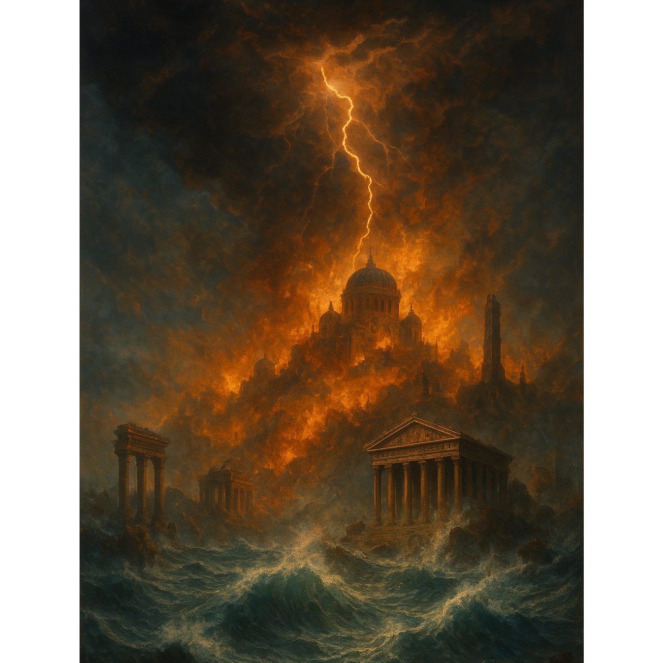 This track rises like a submerged empire breaking the surface — built upon a foundation of colossal rhythm guitars tuned low and resonant, anchoring the song in seismic heaviness, Over them, sweeping orchestral layers — brass fanfares, string surges, and choirs — weave a symphonic grandeur that echoes the halls of drowned temples, The drums strike with bombastic force, shifting from relentless double-kick barrages to ritualistic tom-heavy passages, mimicking the thunder of tectonic upheaval, A soaring lead guitar carves out Mediterranean-flavored melodies, sometimes harmonized, sometimes dissolving into wailing solos like siren calls from the deep, Dark, cavernous bass tones give the whole soundscape a sense of abyssal depth, Vocals move between three voices: deep growls that thunder like prophecy, commanding clean baritone lines that narrate the legend, and layered choir chants that lend an aura of sacred mystery