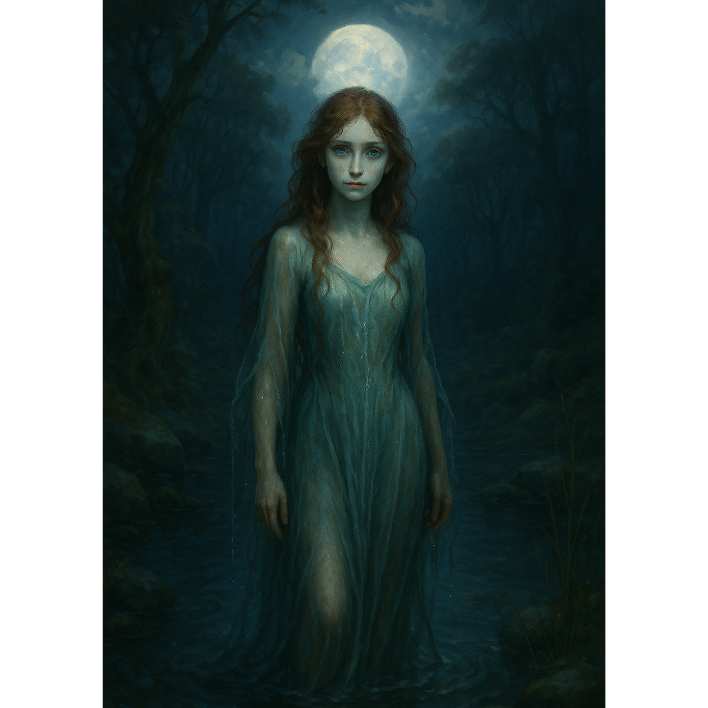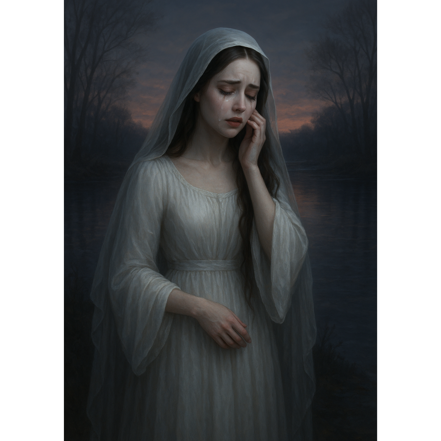 The song should have a haunting quality, blending traditional Mexican folk elements with a dark, cinematic atmosphere, A slow acoustic guitar or harp sets the foundation, joined by mournful strings that rise and fall like waves, Soft percussion, echoing like distant footsteps, adds tension and depth, Folkloristic touches—such as a gentle charango, a distant flute, or hand percussion like cajón—add an earthy, traditional feel, The vocals should be delicate yet full of sorrow, with occasional layered harmonies to mimic ghostly cries, Subtle reverb and echoes create a sense of vast space, as if sung near a river at dusk, both beautiful and unsettling, evoking La Llorona’s eternal lament