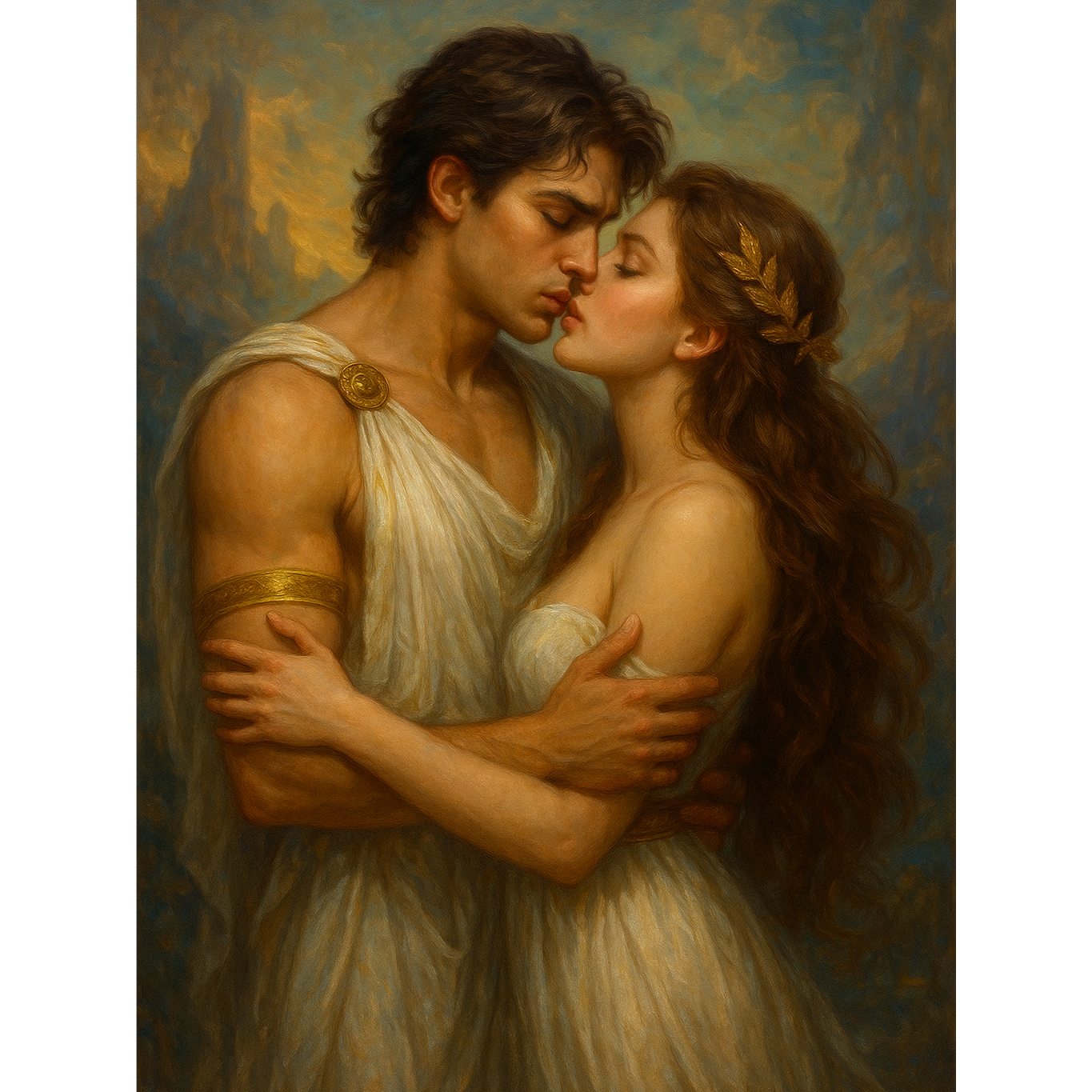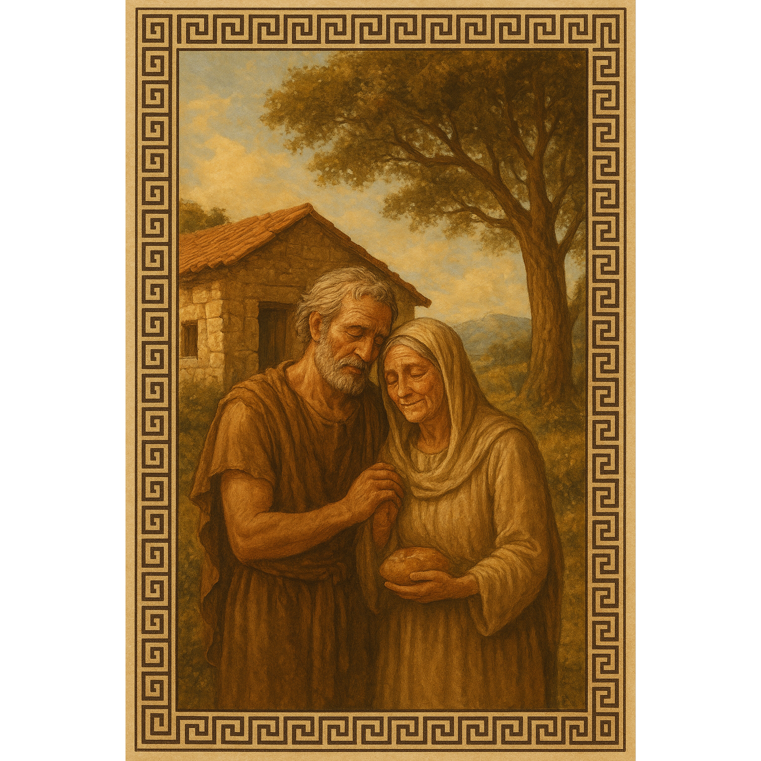 folk, ancient Greek, ethereal, The song should have a gentle, flowing melody reflecting the warmth of Philemon and Baucis’ story, using Ancient Greek modes like Dorian or Mixolydian to evoke a mythic feel, Acoustic instruments such as lyre or kithara, alongside guitar or piano, carry a soft, intimate rhythm, while light strings add a touch of divinity, The verses should be calm and narrative, like a Greek ode, drawing listeners into the humble village home, The chorus can swell, emphasizing their shared love and the gods’ admiration, reminiscent of choral harmonies in ancient theater, Subtle ornamentation, like trills or grace notes, evokes the melismatic style of Greek music, A slow, steady tempo reflects the timeless nature of their devotion, while pauses highlight moments of divine intervention, Harmonies remain gentle, underscoring unity and sacredness, Overall, the music feels tender, ethereal, and steeped in the atmosphere of classic Greek myth