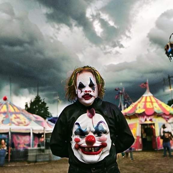 gritty juggalo rap metal, aggressive male carnival barker vocal, deep guttural growls, distorted hype man ad-libs, heavy distorted electric guitars, crushing live drums, detuned bassline, unsettling pipe organ, eerie sampled laughter, occasional vinyl scratching, 105 bpm, 4/4 time signature, E minor key, dark industrial production, horrorcore aesthetic, menacing carnival atmosphere