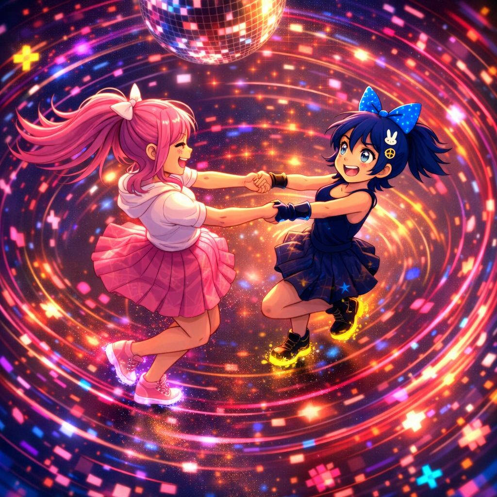 [[too cute to comply, SIDcore spinpop ignition, cursed candy discocore orbit, glitchstatic dancefloor swirl with circular momentum and centrifugal joy, かわいい萌え female vocals lead the release: bright soprano bloom, playful chant-layer spark responses in rhythmic call-and-spin, tempo body-led and kinetic, groove engineered for literal rotation — kick steady and warm, snare/clap crisp and buoyant, bassline elastic and syncopated, hi-hats lightly swung to create centrifugal pull, SID-flavored leads arc in spirals rather than straight melodies; arpeggios loop like turning lights across a mirrorball ceiling, arrangement emphasizes release mechanics: tense and twitchy with minimal percussion; tilts gravity sideways; expands into full circular groove where the body overtakes the mind, energy is playful liberation, shy-kid joy, and bright kinetic bloom — the moment tension exits through motion and the room becomes a spinning circuit of rhythm and light, ]], ‑preserve circular motion and body-led groove, ‑do not flatten into generic EDM stomp or straight-line pop progression, ‑rhythm must feel rotational, ‑not marching, ‑kicks guide the spin rather than dominate; bass stays elastic and syncopated, ‑never rigid, ‑hi-hats retain light swing to maintain centrifugal pull, ‑keep SID-flavored leads bright and spiraling, ‑not harsh or distorted; arpeggios orbit like mirrorball reflections rather than aggressive synth riffs, ‑maintain playful, ‑liberating tone — shy-kid joy, ‑not nightclub aggression, ‑vocals remain clearly female and expressive, ‑bright soprano lead with chant-response layers that support the twirl motif; do not merge voices into a single homogenized layer, ‑avoid heavy compression that removes dynamic lift, ‑preserve space for the groove to breathe so motion feels natural, ‑this track celebrates release through motion — the dancefloor is a spinning circuit of rhythm and light, ‑not a battlefield