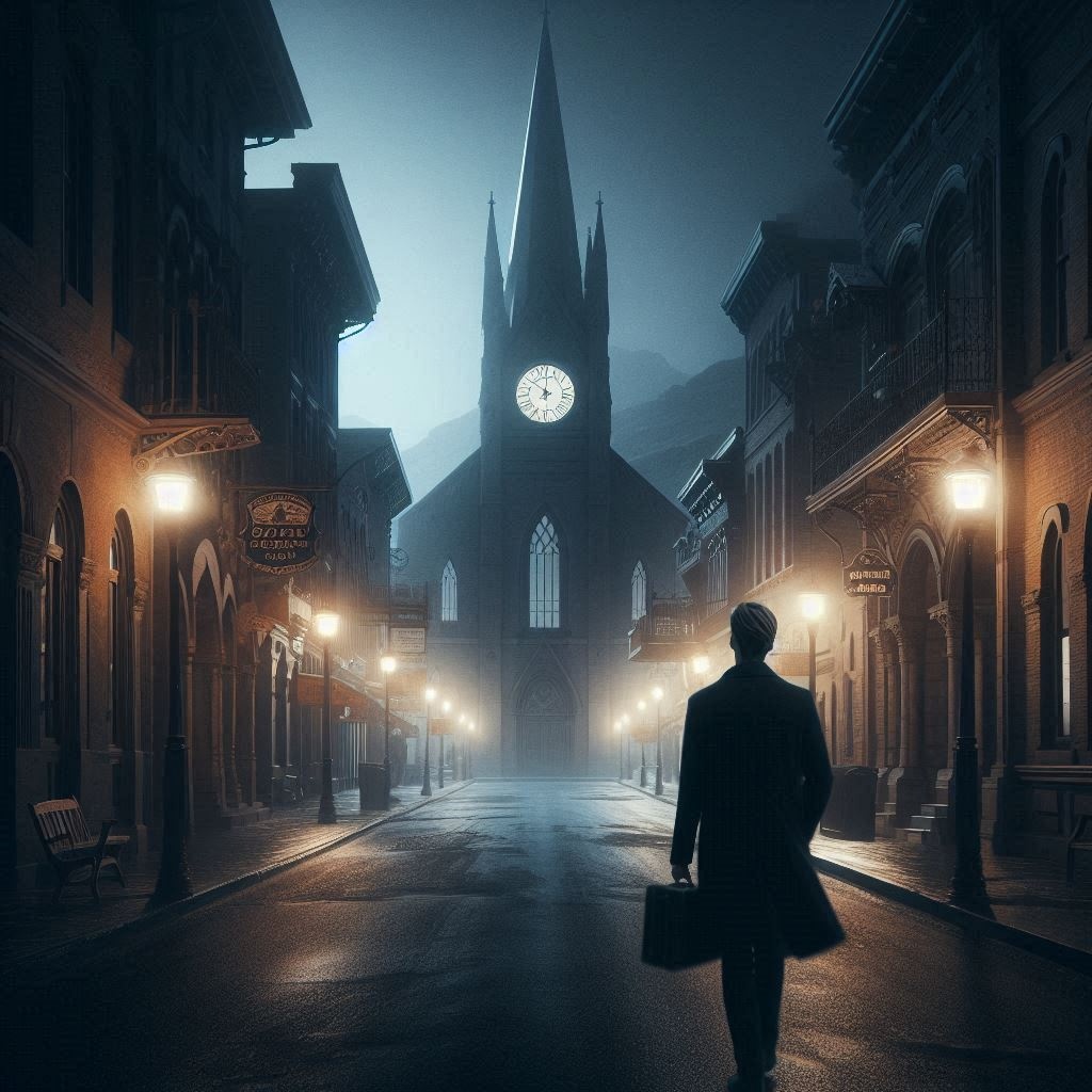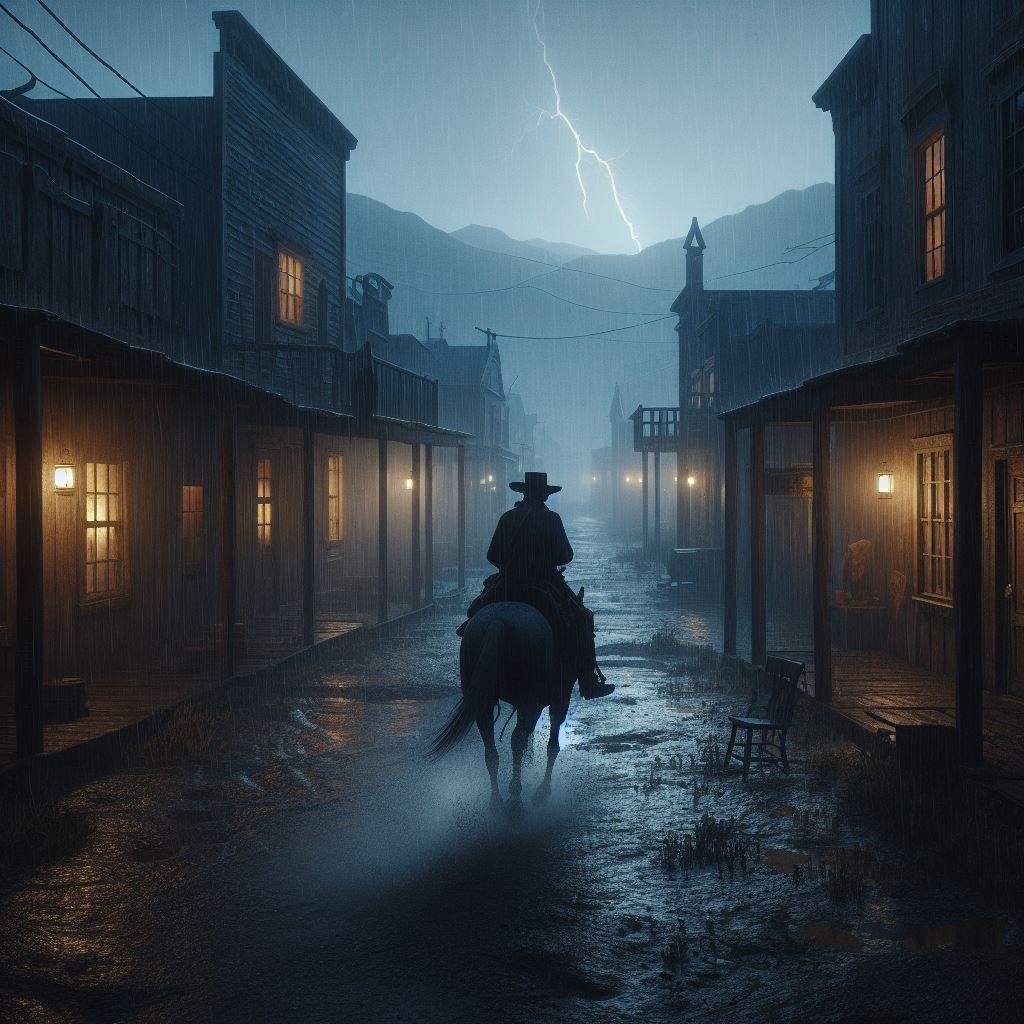 A slow cinematic Western ballad opens with ambient rain, distant thunder, and sparse acoustic guitar, Soft harmonica and slide guitar add texture, Upright bass and brushed snare create a steady, subdued groove, Rugged male vocals lead; harmonies, layered guitars, and tremolo electric swell into a warm, expansive ending