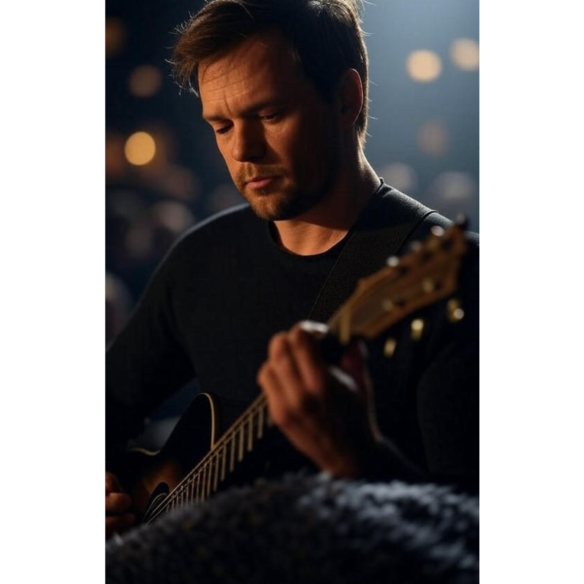 This slow-tempo piece centers on warm acoustic guitar or piano, enriched by soft ambient pads for depth, Calm, deep male vocals maintain a steady, understated delivery throughout, Minimalist percussion and subtle rhythmic elements keep the atmosphere grounded and reflective