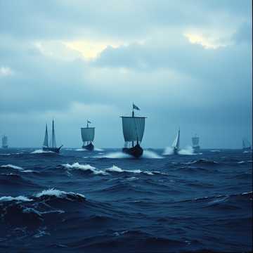Progressive, heavy metal, symphonic metal rock fusion, spooky and dark vibe, distorted riff guitars, punching bassline, echoing drums, melodic organ, bagpipes and strings at background, epic solo at the end, clear and deep male voice, harmonizing sailors choir melodic response at the chorus, wind and thunder sound effects