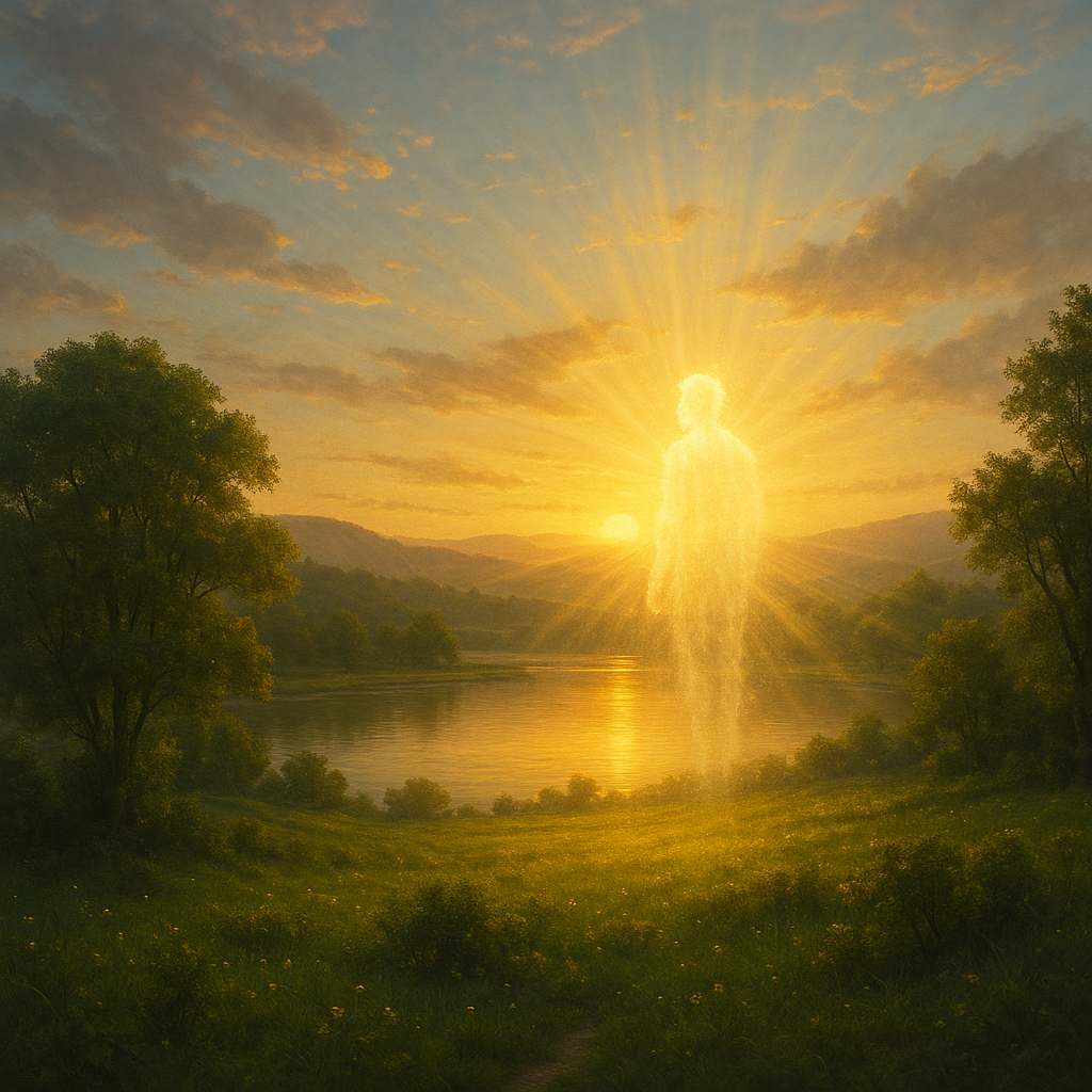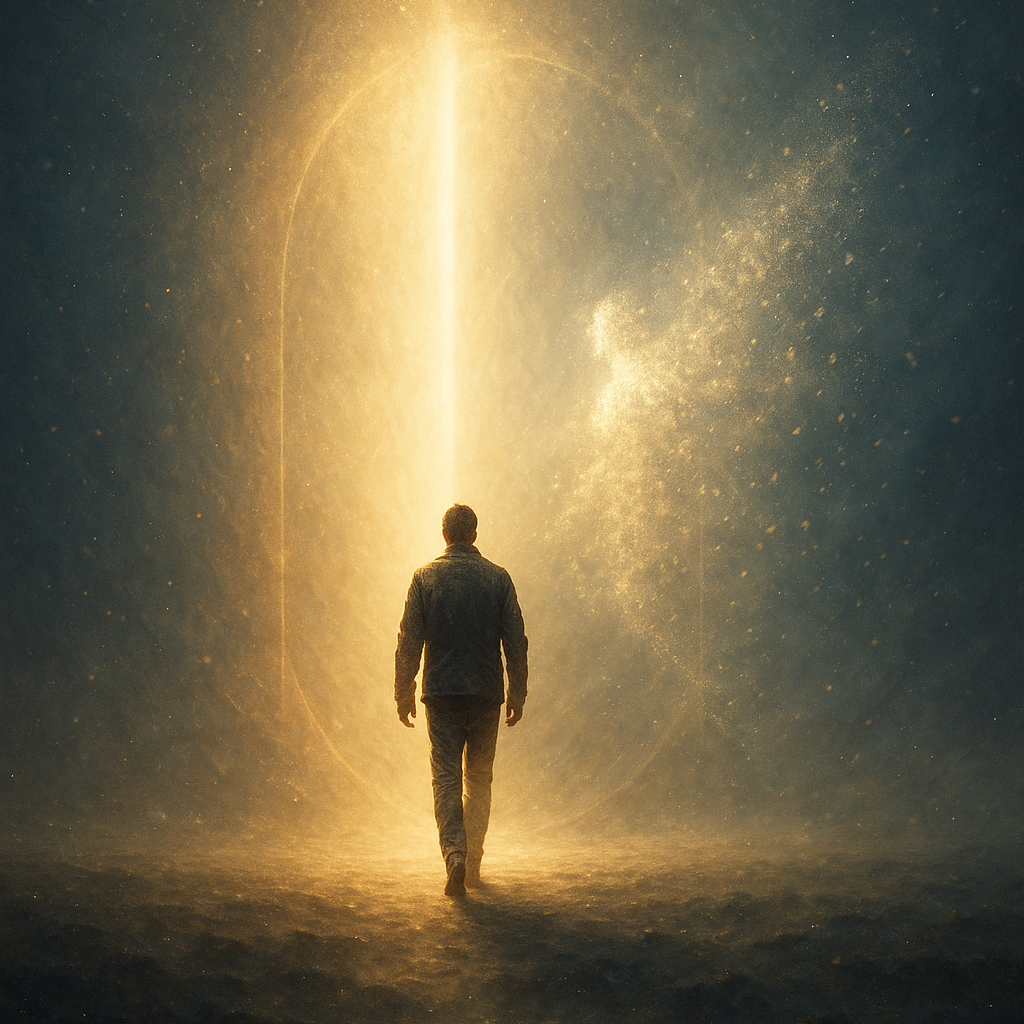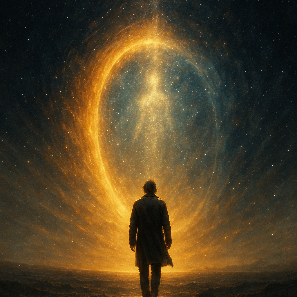 Genre: Cinematic progressive rock ballad with orchestral elements and emotional intensity, Vocals: Deep, expressive male lead with soft ethereal female backing harmonies, Instruments: Atmospheric guitars, analog synth pads, piano, orchestral strings, cinematic percussion, gentle choir, Mood: Transcendent, emotional, spiritual — the moment of transformation and sacrifice, Structure: Ambient intro → reflective verses → soaring chorus → ethereal bridge → climactic finale → soft fade, Production: Wide cinematic mix, deep reverb, layered harmonies, warm analog tones, and dynamic rise-and-fall, Theme: Transcendence, light, and the beauty of self-sacrifice at the end of time