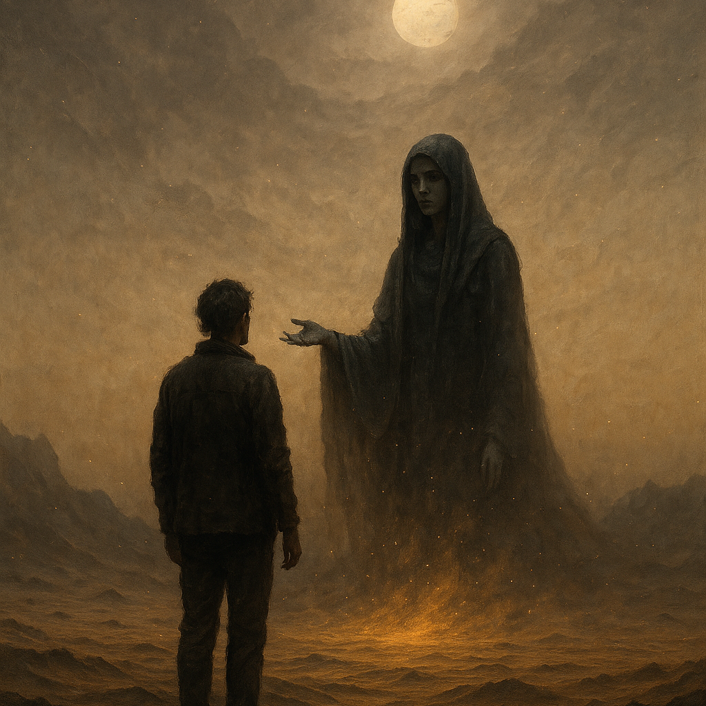 Genre: Progressive rock opera with cinematic, mystical atmosphere, Vocals: Expressive male lead and ethereal female voice (as the Oracle), dramatic duet in chorus, Instruments: Electric and acoustic guitars, deep bass, analog synths, atmospheric pads, orchestral strings, cinematic drums, haunting choral textures, Mood: Mysterious, dark, spiritual, and emotional, Structure: Ambient intro → narrative verses → dramatic duet chorus → instrumental bridge → final fading outro, Production: Wide cinematic mix, rich reverb, layered harmonies, evolving tempo and tension, Theme: Revelation and destiny — the meeting between man and the voice beyond time