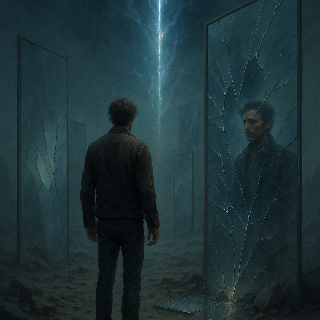 Genre: Progressive rock opera, cinematic and emotional, Vocals: Dynamic male lead with layered harmonies, ghostlike backing vocals representing alternate selves, Instruments: Electric guitars with delay, analog synths, deep bass, evolving drums, atmospheric pads, orchestral accents, ambient textures, Mood: Futuristic, haunting, and introspective — tension between chaos and beauty, Structure: Atmospheric intro → dynamic verses → powerful layered chorus → spoken/sung bridge → epic finale → ambient fade, Production: Wide stereo, shifting time signatures, evolving textures, deep reverb, rich harmonics, Theme: Multiple realities colliding — identity, reflection, and transcendence through the rift of time