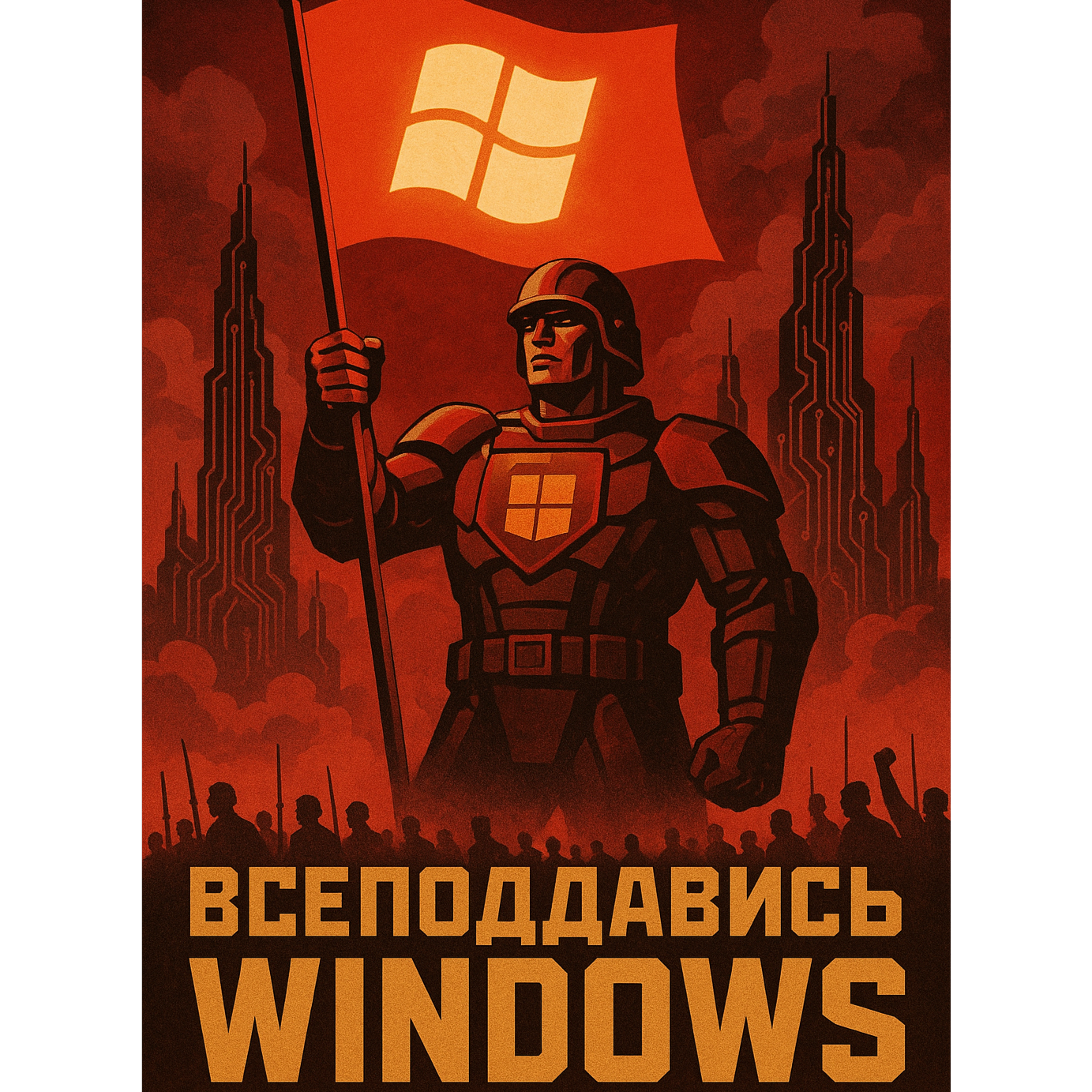 A heavy, Soviet-style opera metal anthem glorifying Microsoft and Windows, Opens with deep brass, low male choir, and rolling snare for an ominous march, Verses in commanding baritone with operatic harmonies and strings, Chorus explodes with metal riffs, double-kick drums, and a massive choir, evoking a national anthem, Military snare rolls and orchestral stabs drive the rhythm, Bridge shifts key with triumphant brass and harmonized guitars, leading to a layered, climactic final chorus of cymbals, fortissimo choir, and roaring guitars, ‑[compression][distortion][noise][shimmer][background noise][bad instrument][muffled][tinny][suppressed]