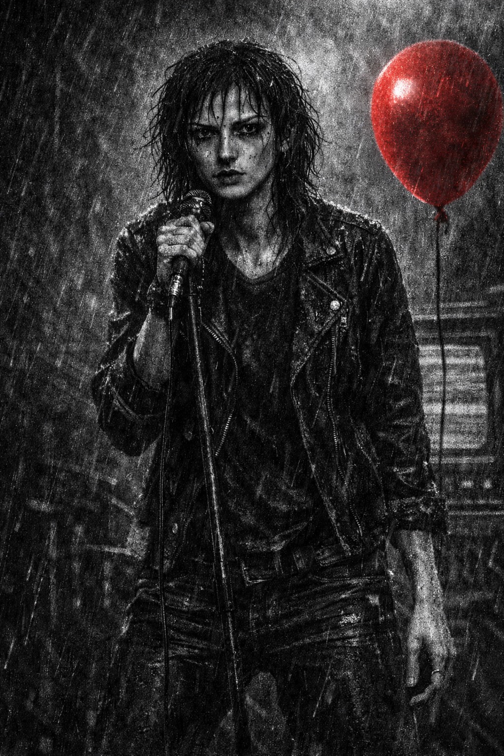 Gritty, emotional live garage rock performance with female lead vocals (raspy, defiant, with moments of vulnerability), Overdriven guitars with raw, loose riffs, walking bass with a dirty edge, and drums that swing between swagger and urgency, Recorded in a secret, dimly lit backroom club in the year 2077, with muffled crowd noise, clapping, and occasional shouts from the audience, Imperfect and chaotic – slight mic pops, amp hum, and feedback squeals between lines, Occasional whispered backing vocals (female) adding ghostly echoes during the bridge, Extended instrumental sections with audience energy rising before each chorus