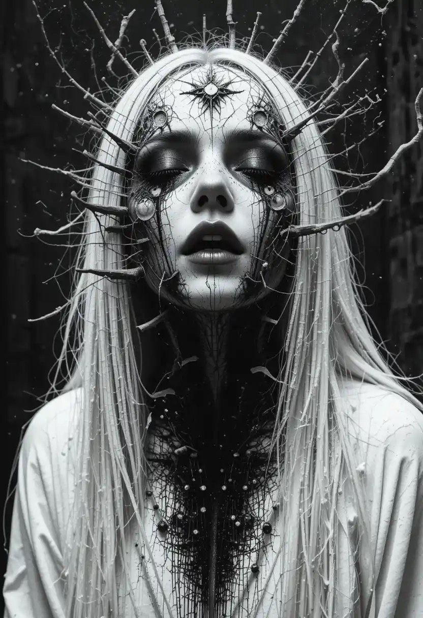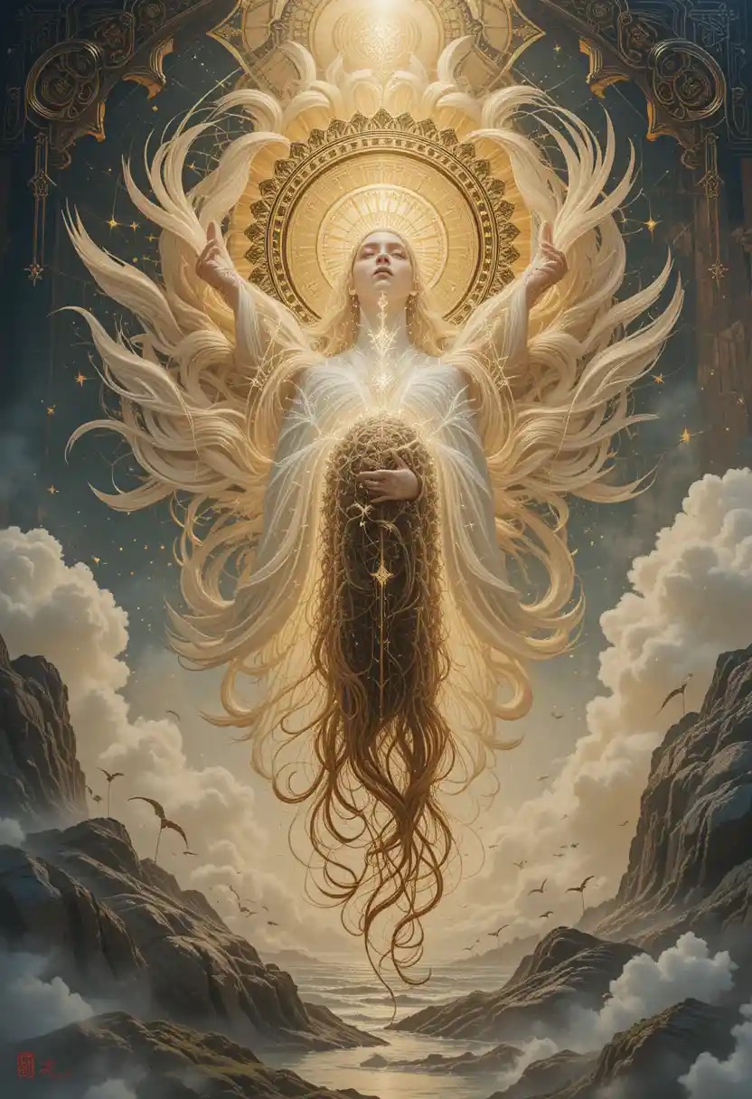 Female vocal, digital hardcore chaos, glitch overload, distorted screams, shattered melodies, tempo warping, rhythmic noise violence, fractured divine identity