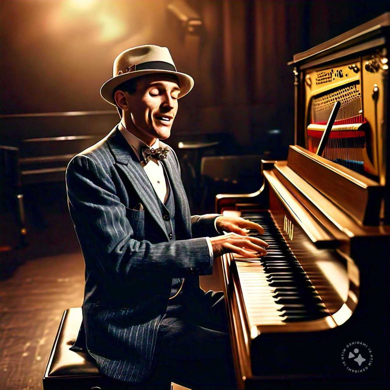 125 bpm, Ragtime, big band, swing, extremely talented pianist, complex layered male vocals, jazzy, silly trumpets