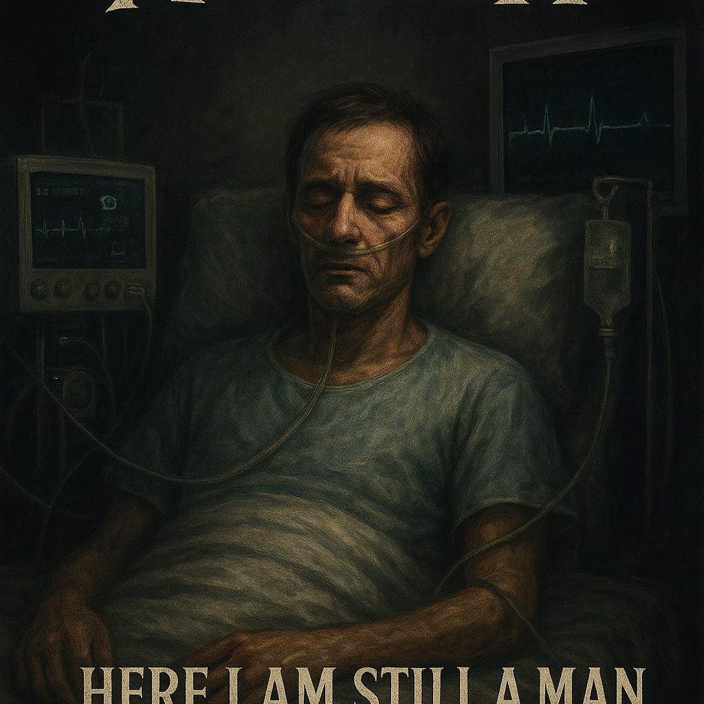 Create a dark metal ballad, Tempo: 70 BPM, slow and heavy, Key: D minor, melancholic and haunting, Instrumentation: Heavy distorted guitars (palm-muted riffs and melodic leads), thick bass, slow deliberate drums with tom emphasis, ambient synth pads, subtle orchestral strings, minimal piano in intros, Vocal style: Dark baritone narration, whispered layers, occasional melodic growls, Mood: Haunting, epic, dramatic, melancholic, theatrical, Effects: Reverb and delay on guitars and vocals, subtle tremolo and phaser for atmosphere, faint metallic percussion, Structure: Build tension in intros, layered vocals in chorus, sparse instruments in outro, chilling ending with respirator and alarm sound