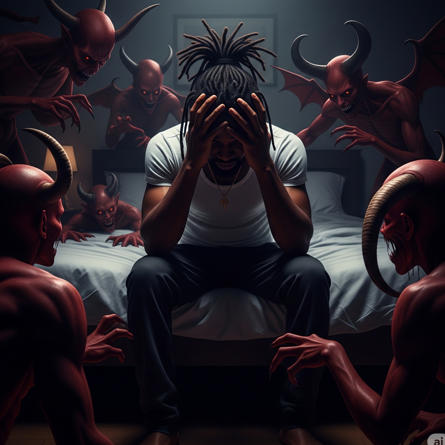 Slow, moody ambient hip hop track built on deep sub-bass and airy low-end pulses, Add detuned synth pads and shimmering drones for an astral, dreamlike atmosphere, Percussion should be light, glitchy, and off-kilter—like drifting thoughts on a sleepless night, Vocals are weary, reflective, and poetic, blending sung and spoken lines about fatigue, faith, and creative burnout, Layer whispers and ghostly echoes to mirror inner dialogue, Sparse piano or guitar textures fade in and out, Outro descends into distorted laughter, reversed reverb, and ambient noise, Tone: exhausted yet transcendent, existential therapy rap meets cosmic lullaby