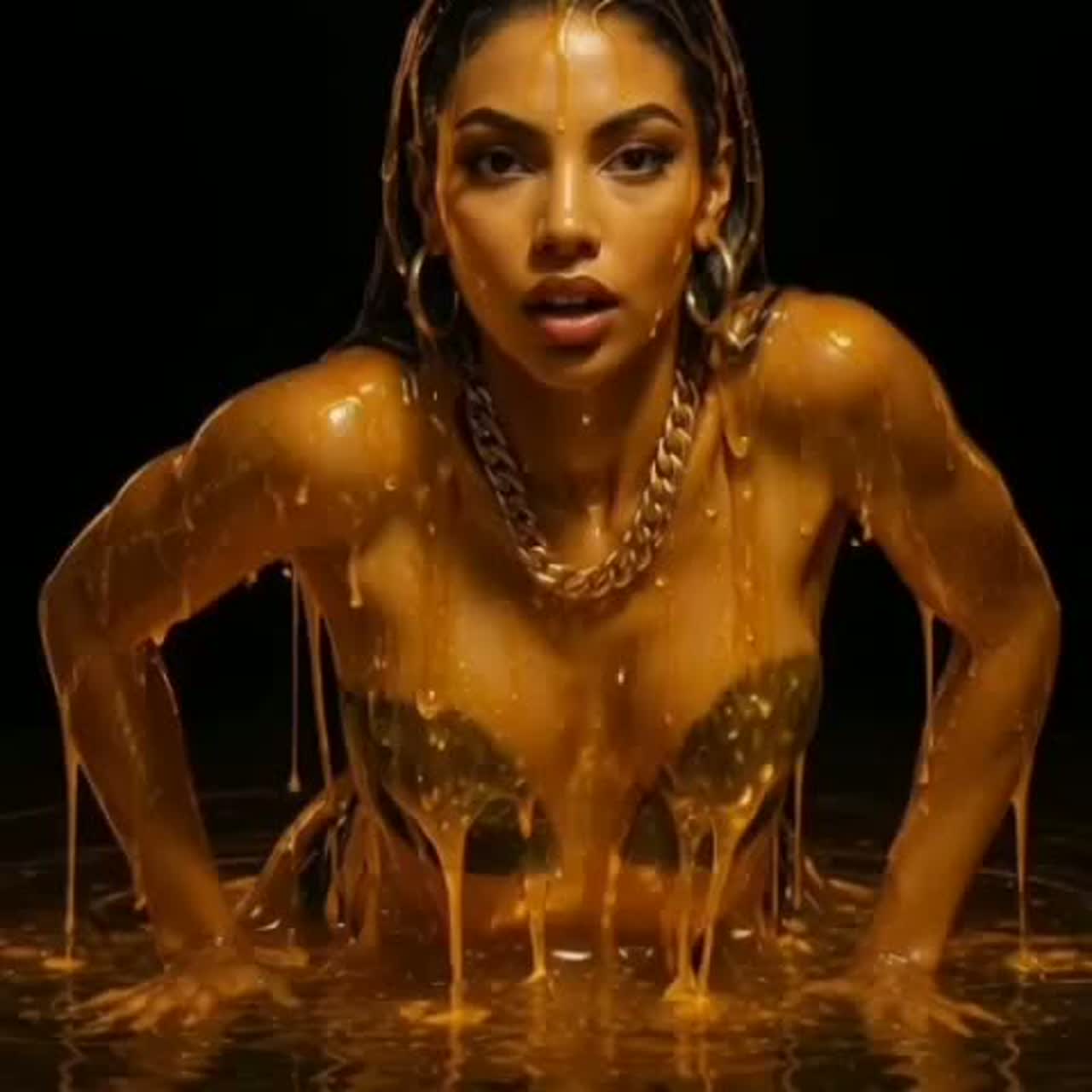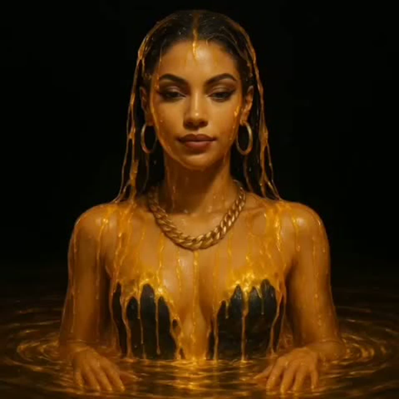 Create a dark cinematic pop track with emotional tension and controlled sensuality, Female lead vocal with a soft hypnotic tone in the verses that grows into powerful emotional delivery in the chorus, Mood should feel like a mysterious awakening—seductive, dangerous, and elegant, Use atmospheric pads, deep sub bass, distant vocal echoes, and low piano accents, Introduce tribal taiko drums and pulse percussion at the bridge to build dramatic intensity, Include haunting vocal layering, breath textures, and dynamic rise, Tempo around 92 BPM, minor key, warm dark tone, heavy reverb space, The overall energy should feel like a forbidden creation discovering her purpose—sharp, intimate, and cinematic with molten gold aura energy in the production