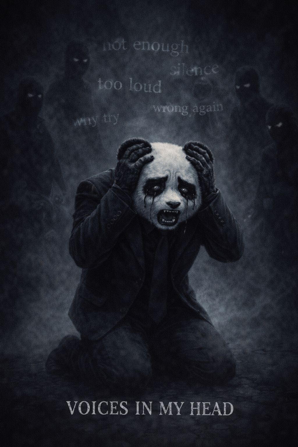 Rebuild into final chorus like a panic attack crescendo, cinematic darkwave industrial trap, haunting female vocals, raw male rap, atmospheric horror textures, glitch transitions, heartbeat percussion, cinematic choir pads, slow to mid-tempo, oppressive and suffocating atmosphere, high dynamic contrast, dark and immersive production