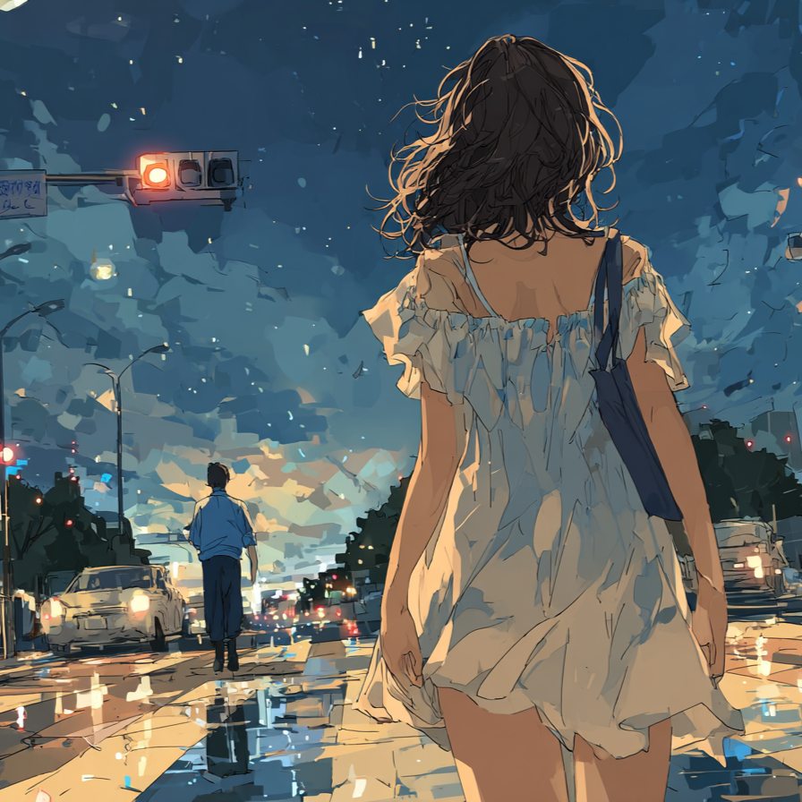 Lo-Fi Indie Pop × Dreamwave, A slow-moving 88 BPM groove that feels like it’s breathing just past midnight, Soft, slightly behind-the-beat drums carry warm, sustained bass notes, Ambient electric guitar with gentle delay drifts through the stereo field, blending with lush, wide synth pads that create a dream-like haze, Female vocals are whispered and intimate in the verses, opening up with airy layering in the choruses, The entire track holds the mood of a quiet conversation after 2 AM — suspended between staying and letting go, with the sound of streetlights and rain lingering in the air