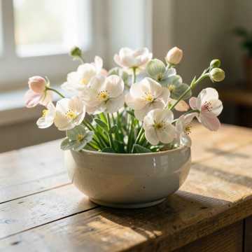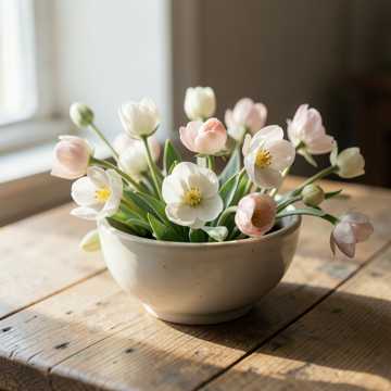 Instruments: warm acoustic piano (main with precise tone), upright bass (soft and stable), brushed jazz drums (light texture), gentle ambient pad, subtle strings texture, light pizzicato strings accent, Structure: start immediately with a delicate piano motif, flow: Theme A → refined variation → Theme B with clearer melodic shape → development with subtle accents → expressive piano improvisation → return theme → soft outro, extend sections to reach ~4 minutes, Performance: precise touch, slightly articulated phrasing, controlled dynamics, smooth transitions, avoid complexity, maintain clarity and balance, Mood: careful arrangement of flowers, focused and calm, soft and organized movement, warm and peaceful spring workspace, gently immersive atmosphere
