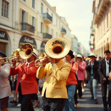 Brisk, syncopated ska punk rhythm drives the track, anchored by punchy upstrokes on electric guitar and a lively walking bass, Horn section interjects tight stabs and melodic riffs, Drums deliver energetic snare hits, hi-hat accents, and offbeat fills, fueling a playful, infectious sound