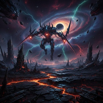 Hyper-technical blackened deathcore / thall hybrid at 230+ BPM, staggered polymeter riffs and dissonant chords, Male vocals: alternating abyssal growls and high shrieks, Drums in constant evolution—blast beats into metric modulations, jarring snare placements, gravity blasts, One spotlight section for an over-the-top shreddy guitar solo over a droning low string, Mix is dense but surgical: guitars razor-thin up top, bass snarling in the low-mids, vocals right in your face, mathcore, djent