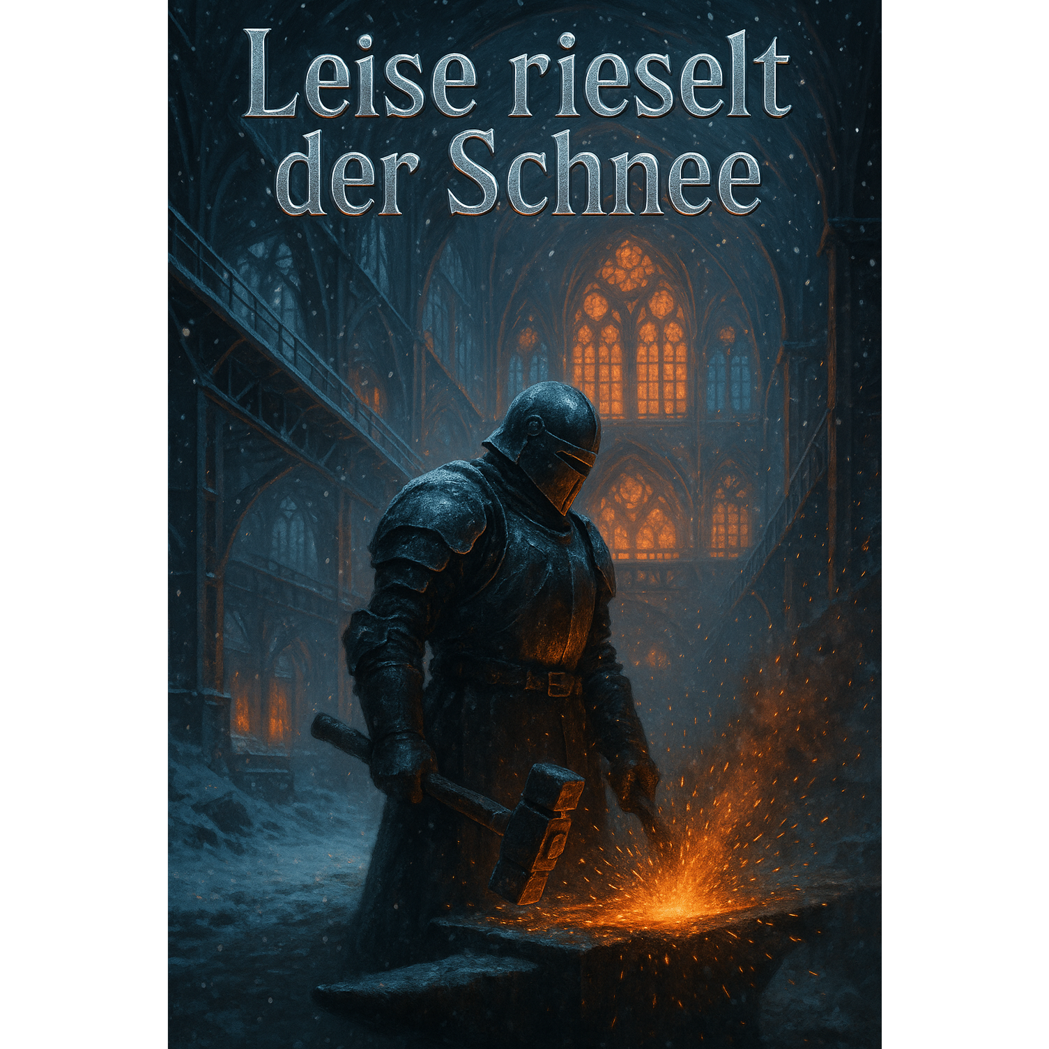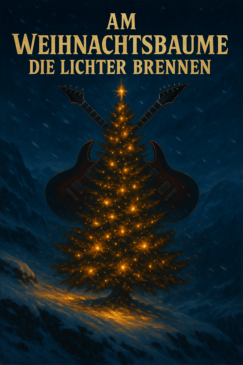 A German Industrial Metal Christmas interpretation of “Leise rieselt der Schnee, ” transforming the gentle carol into a darkly majestic hymn, Deep, distorted guitars build a slow and powerful rhythm, accented by heavy drums that echo like hammers on steel, Atmospheric synth layers create an icy cathedral ambience, while church bells and subtle choral voices weave through the mix, The tempo remains solemn but intense, evoking both reverence and strength, Male vocals are deep and resonant — half sung, half spoken — blending warmth and industrial grit, The extended solo introduces a melodic metal guitar lead with emotional phrasing, supported by dark orchestral pads, Production is dense and cinematic, balancing metallic aggression with sacred beauty, The sound captures the essence of a frozen cathedral filled with fire, faith, and heavy emotion — a true Stahlmann-style Christmas anthem