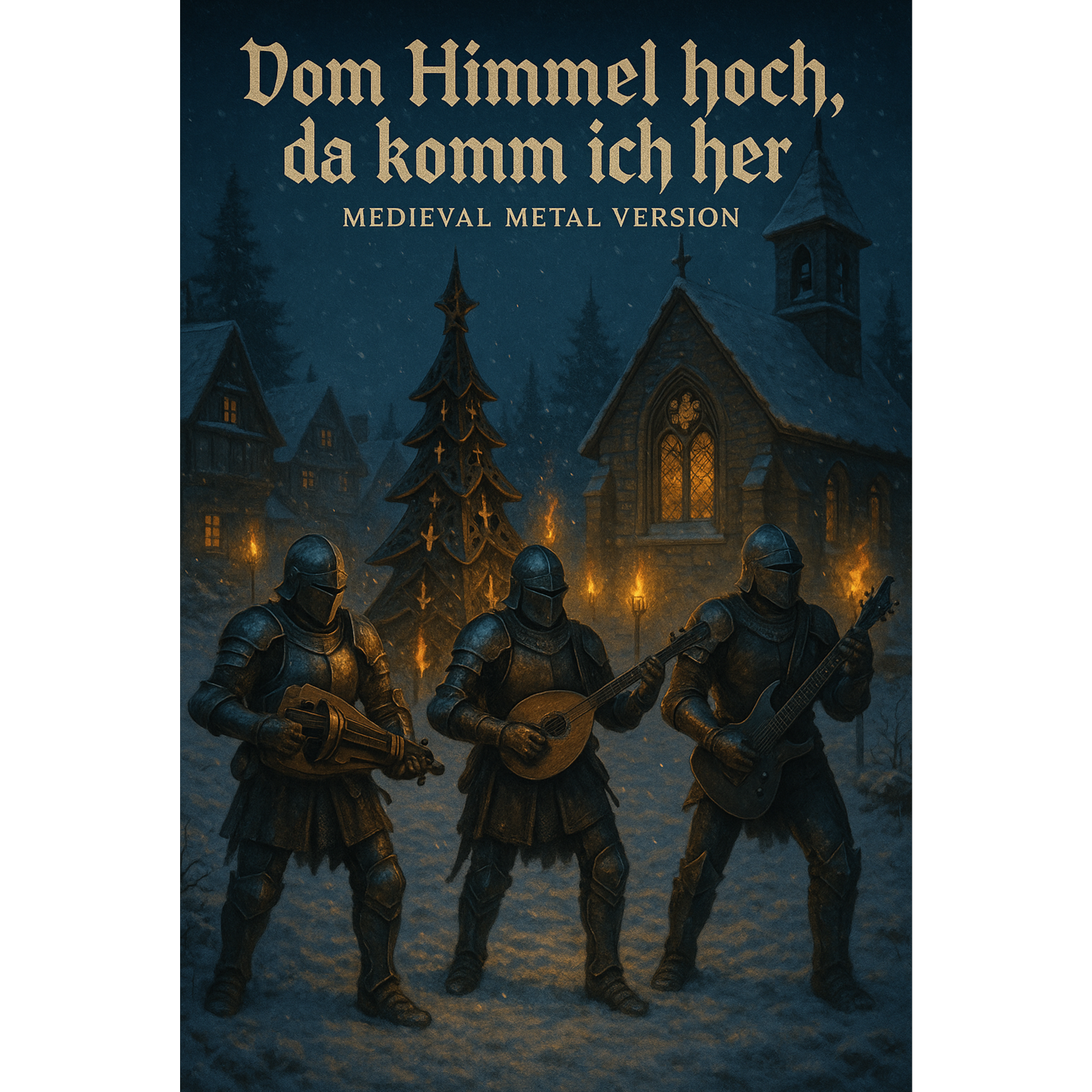 A powerful medieval-metal Christmas production blending ancient festive atmospheres with heavy modern energy, Guitars should combine bright overdriven metal riffs with melodic lines inspired by medieval modes, supported by hurdy-gurdy drones and subtle bagpipe-like harmonics, Drums are strong and commanding with a tight, punchy kick and a broad, echoing snare that creates a marching winter rhythm, Bass is warm, gritty and prominent, reinforcing the low end with steady momentum, Vocals should be clear, solemn and expressive, carrying the traditional hymn text with a dignified yet powerful delivery suitable for a metal arrangement, Choruses and key passages should widen with layered harmonies for a festive, ancient vibe, The Extended Solo is long and dramatic, mixing medieval scales with modern metal phrasing for a triumphant peak, Maintain balanced loudness without end-volume rise