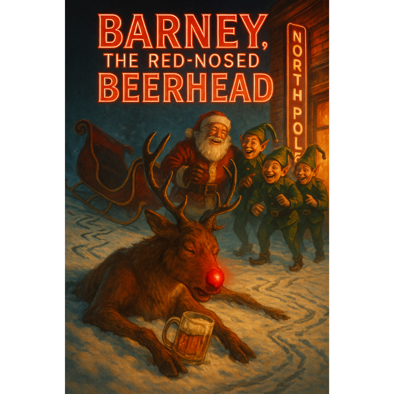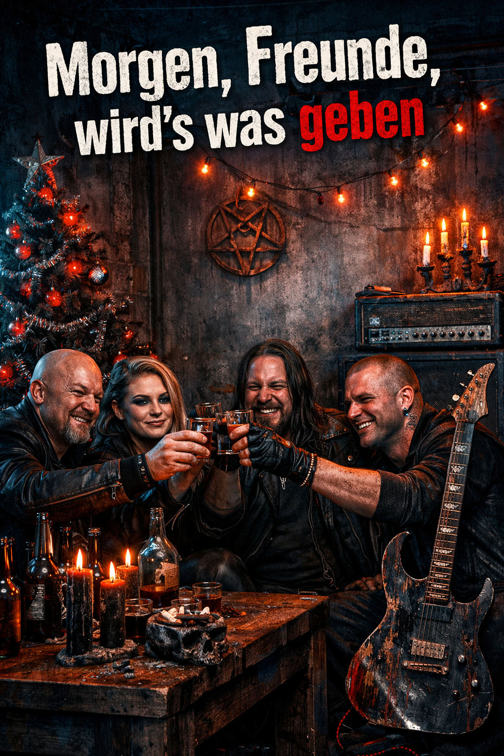 A comedic heavy metal Christmas song inspired by the humorous hard rock style of German fun-metal bands, Loud, punchy drums drive the song with thunderous double kicks and sharp snare hits, Guitars are thick and distorted, alternating between heavy riffs and catchy power-chord progressions, Bass is full and percussive, matching the guitars for tight rhythmic impact, Vocals are male, bold and playful, with a mix of clean singing and shouted humor, Backing vocals add gang shouts and exaggerated Christmas chants, Sleigh bells and choral elements appear briefly, used ironically within the mix, The extended solo features flashy guitar licks, whammy bends, and fast shredding, leading back into a chant-filled final chorus, The tone is festive yet rebellious — a headbanging, beer-soaked parody of holiday cheer with unapologetic rock energy