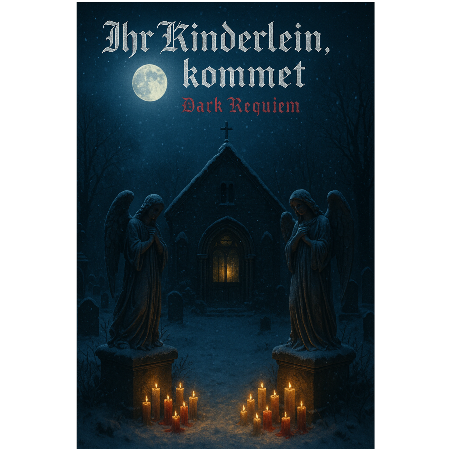 A melodic Gothic Dark Metal Christmas reinterpretation of “Ihr Kinderlein, kommet, ” merging sacred atmosphere with haunting melancholy, Clean guitars open softly, joined by choral pads and symphonic strings, As the song builds, distorted guitars and deep bass enter, forming a slow, powerful rhythm, Drums are rich and resonant, combining soft tom patterns with heavy mid-tempo hits, Vocals are deep, emotional, and solemn — male or female — blending clean gothic tone with gentle vibrato, Subtle bells, choirs, and organ textures maintain the Christmas spirit while surrounded by dark harmonic layers, The extended solo is melodic and expressive, rising through reverb and orchestral depth before melting back into choral ambience, The production feels cinematic, cold, and luminous — like a midnight mass in a frozen cathedral where hope and darkness meet