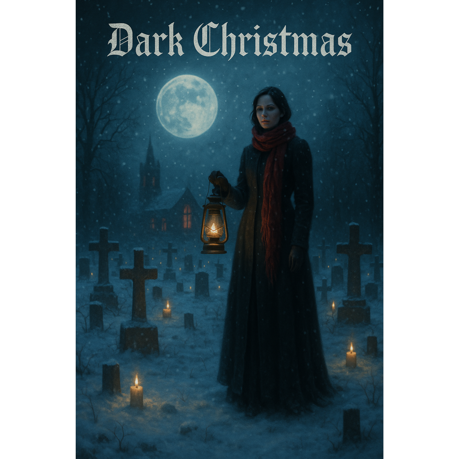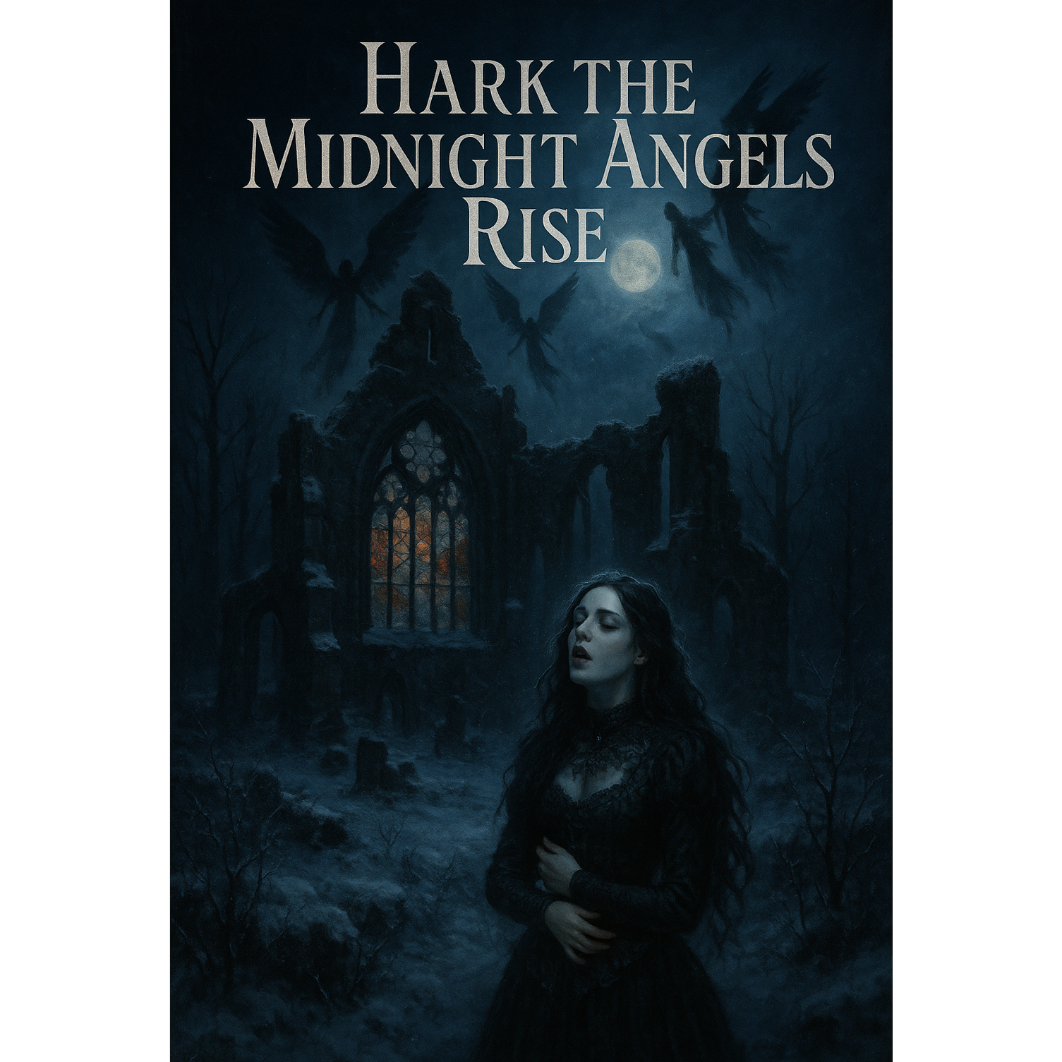 A Gothic Dark Rock Christmas ballad blending the haunting elegance of a winter tale with deep emotional power, The song features atmospheric guitars with warm distortion and shimmering chorus effects layered over a slow, dramatic beat, Drums are deep and resonant, carrying a sense of solemn movement, while bass flows smooth and heavy, Female vocals take the lead — dark, emotional, and expressive, combining softness with strength, Subtle Christmas elements like chimes, bells, and choir pads enrich the sound without turning it too sweet, The verses build tension through minimal instrumentation and reverb-heavy ambience, while the choruses bloom with powerful guitars and melodic harmonies, The extended solo features expressive bends and echoing tones, merging beauty and melancholy, The overall mood is cinematic, moody, and wintry — a dark fairytale wrapped in snow and longing
