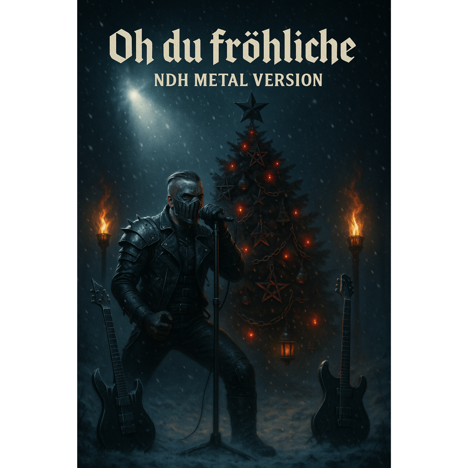A powerful Neue-Deutsche-Härte Christmas-metal production with heavy guitars, punchy drums and a dark festive atmosphere, Guitars should be deep, distorted and rhythmically aggressive, blending tight chugging riffs with cold melodic lines shaped by minor harmonies, Drums hit hard with a tight, forceful kick and a sharp snare to drive the track with NDH-style precision, Bass is gritty, warm and forward in the mix, anchoring the low end with strong weight, Vocals are intense, rough-edged and expressive, combining a commanding NDH tone with solemn delivery of the traditional lyrics, Subtle Christmas elements like light bells or soft choral pads should be layered tastefully to add a winter feel without breaking the heavy mood, The Extended Solo is long, combining NDH phrasing with icy festive motifs and a dramatic rising structure, Maintain even loudness without an end-volume rise