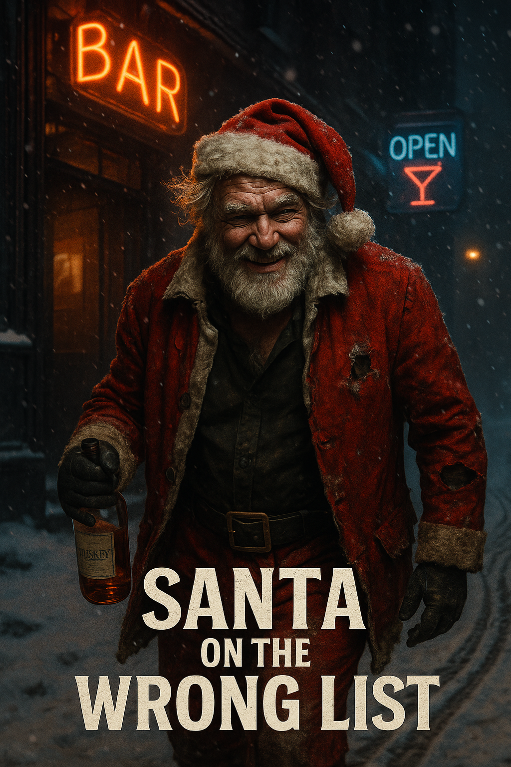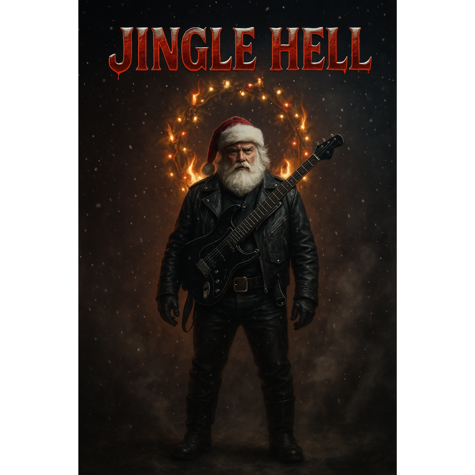 A gritty, humorous hardrock and rock’n’roll fusion with a dark yet playful holiday edge, Drums should deliver a tight, driving groove with punchy snare hits and a swaggering rhythm that supports the comedic mischief, Electric guitars are central, combining crunchy hardrock riffs with blues-infused rock’n’roll licks and occasional sleazy bends for attitude, Bass should be warm, rounded, and forward, reinforcing the groove with steady, confident motion, Subtle background elements—lightly distorted organ or faint jangling accents—may enhance the festive-but-dark atmosphere without dominating the mix, Vocals are expressive and slightly rough, carrying equal parts humor and grit, with clear phrasing for the storytelling, Backing shouts or gang-style responses may lift key punchlines, The Extended Solo features a spirited, blues-driven rock guitar lead that rises into a chaotic but fun climax before Verse 3, Overall loudness must remain balanced without end-of-song spikes