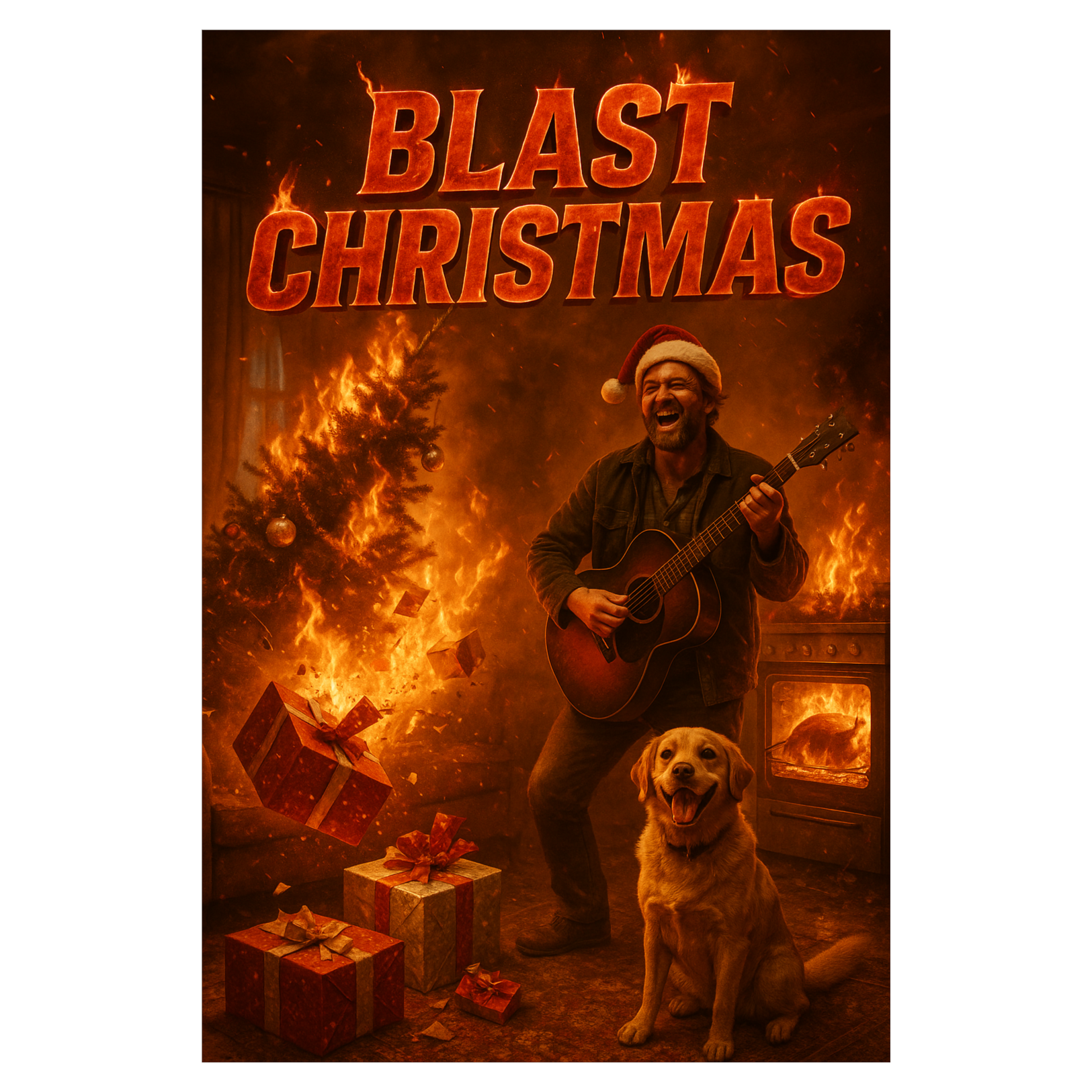 A Hard Rock / Comedy Metal Christmas song blending the tongue-in-cheek humor of German fun metal with the swagger and energy of classic rock, Guitars deliver gritty open-chord riffs and blues-driven power grooves, supported by a punchy, mid-tempo drum beat with heavy snare hits, Bass follows tight and warm, adding groove and drive, Vocals are male, rough and expressive, with a playful sneer and sarcastic tone, Gang shouts and crowd-style choruses boost the humor, Occasional sleigh bells and church chime samples appear ironically within the mix, The extended solo features a dirty blues-rock guitar with slides and wild bends before crashing back into a roaring final chorus, The mix is bright, loud, and cheeky — pure rock ’n’ roll chaos in Christmas clothing, full of fun, fire, and glorious disaster