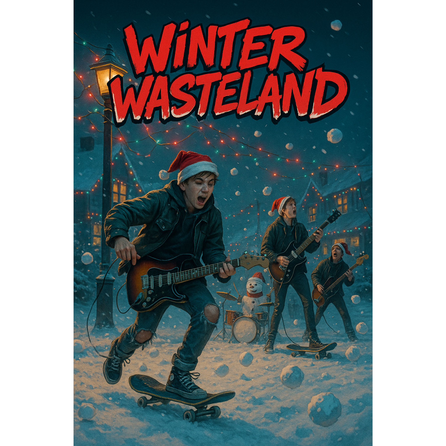 A fast, cheerful Punk Rock Christmas song with the energy and rhythm of modern skate punk, Up-tempo drumming with tight snare rolls and punchy kick drives the song forward, Guitars are bright, crunchy, and melodic, delivering classic power-chord riffs mixed with short lead licks, Bass is warm, slightly overdriven, and rhythmic, keeping the groove tight beneath the chaos, Vocals are energetic, youthful, and slightly raspy — male or female — performed with playful humor and strong sing-along phrasing, Handclaps and sleigh bells accent the beat, adding a festive sparkle to the aggressive drive, The extended solo combines punk-style surf riffs with sleigh-bell percussion and crowd shouts, The overall production is clean but raw, joyful yet rebellious, turning holiday cheer into a loud celebration full of speed, fun, and snow-covered anarchy