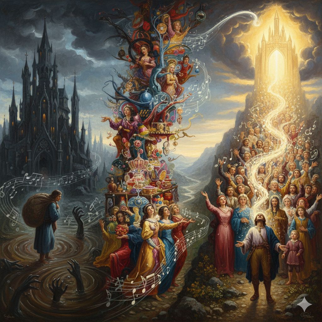 Style: Panoramic A Capella Choir, 5 minutes, Represent John Bunyan's "Pilgrim's Progress" condensed spiritual journey, Large international choir (male/female/children), layered harmonies, canon entrances, call-and-response, Baritone/tenor solo for protagonist, deep growl bass for despair, super-soprano for climactic peaks, Wide stereo imaging, cathedral reverb, smooth transitions, Dynamic contour: tension → despair → temptation → resolve → triumph → reflective outro, Scene timing: 0:00–0:20 Intro (spoken), 0:20–0:50 Scene1A, 0:50–1:10 Scene1B, 1:10–1:40 Scene2A, 1:40–2:00 Scene2B, 2:00–2:30 Scene3A, 2:30–2:50 Scene3B, 2:50–3:50 Scene4A, 3:50–4:10 Scene4B, 4:10–5:00 Outro, No instruments; orchestral effect simulated via vocal layers, evoke despair, temptation, hope, and spiritual triumph with immersive auditory experience