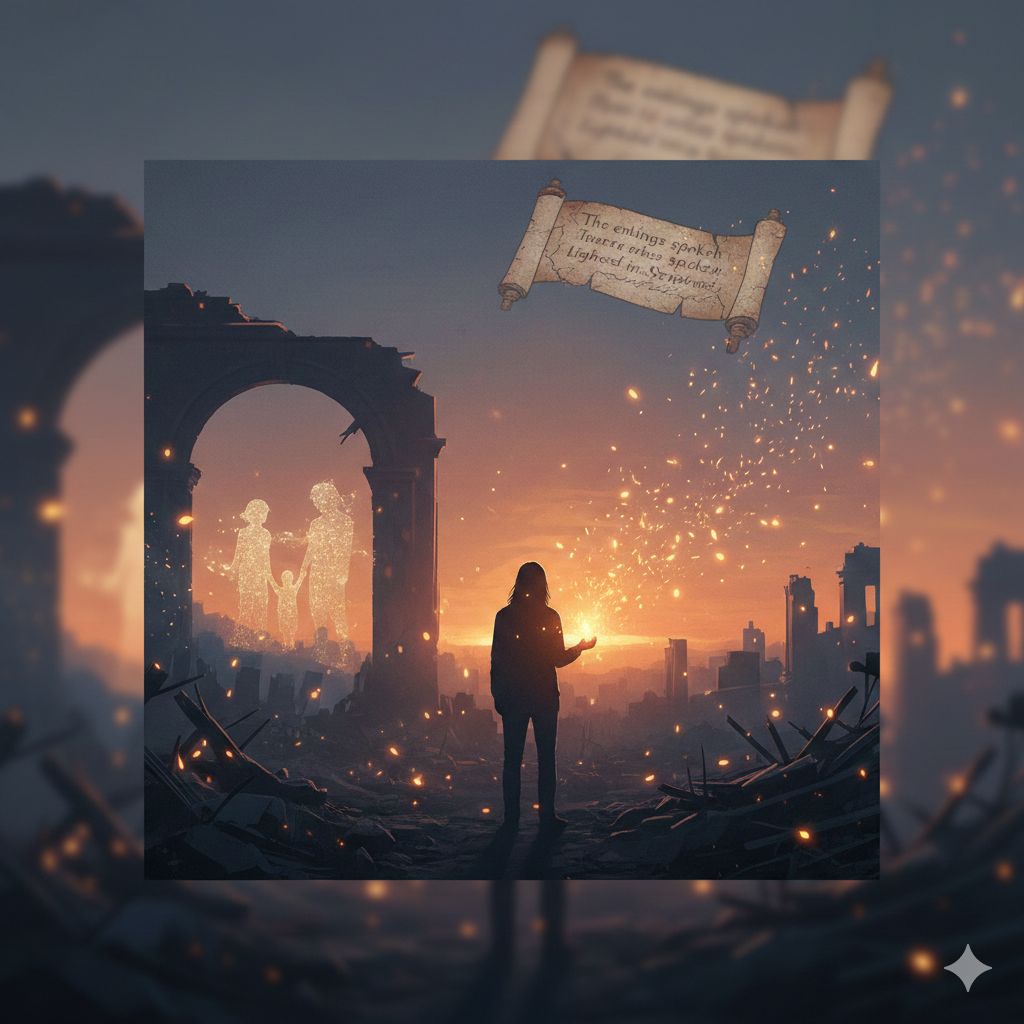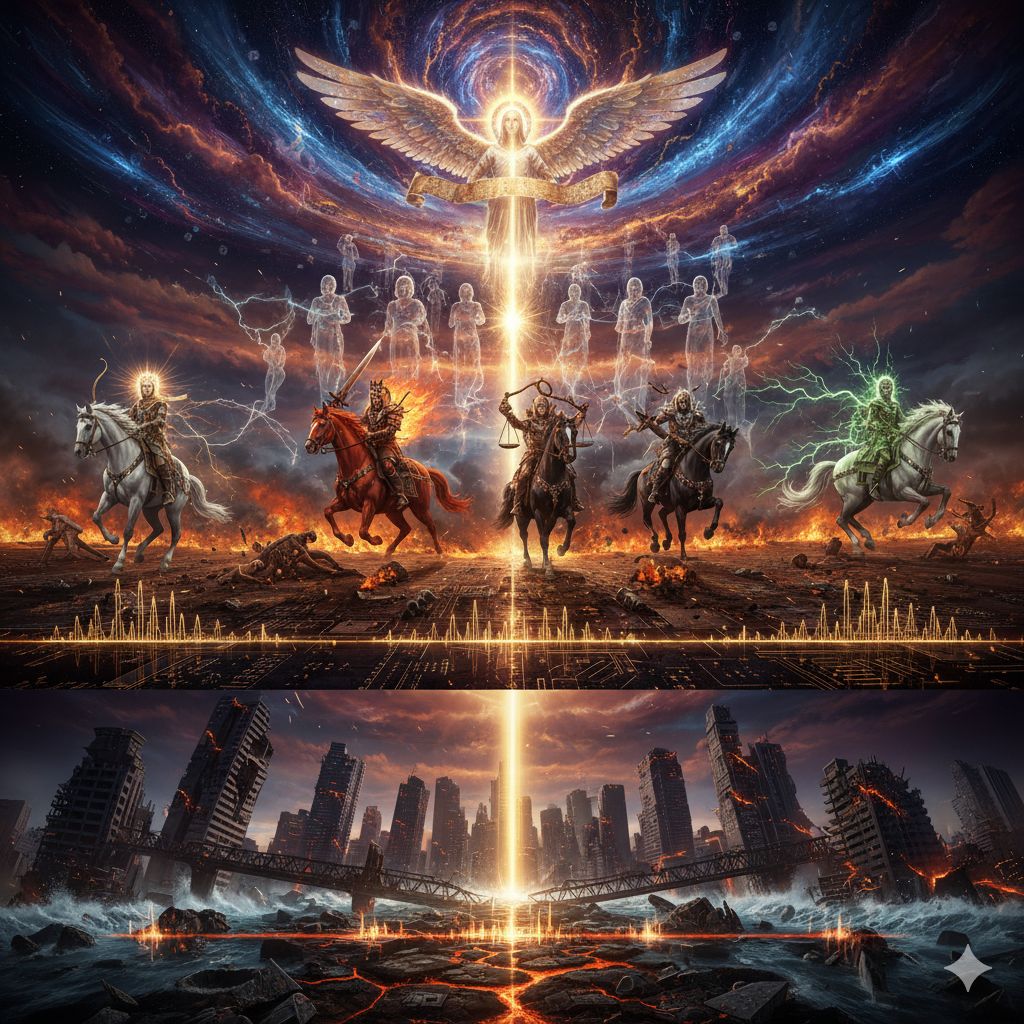 Revelation Ascendant / 계시의 정점, Hyper-Cinematic Electronic Industrial Trance, Cinematic Apocalypse, 3:30 minutes, massive orchestral strings, piercing brass, hyper-percussive drums, reality-bending synths, abyssal sub-bass, epic wordless choir, distant thunder, rolling wind gusts, explosions, fire crackle, collapsing structures, approaching horse hooves, distant screams, celestial chimes, ethereal pads, harp arpeggios, shimmering bells, extreme dynamic range, maximal stereo width, cinematic punch, artistic FX layering, apocalyptic, awe-inspiring, epic, sublime, terrifying, conveys chaos, judgment, salvation, and glory of Revelation through immersive music and FX, narrative-driven, full orchestral depth, primal energy, transcendent climaxes, epic tension and release, surreal cinematic soundscape, immersive spatial dimension, layered harmonics, epic risers, haunting whispers, dramatic build-ups, chaotic drops, reflective resolution, divine light and cosmic aftermath